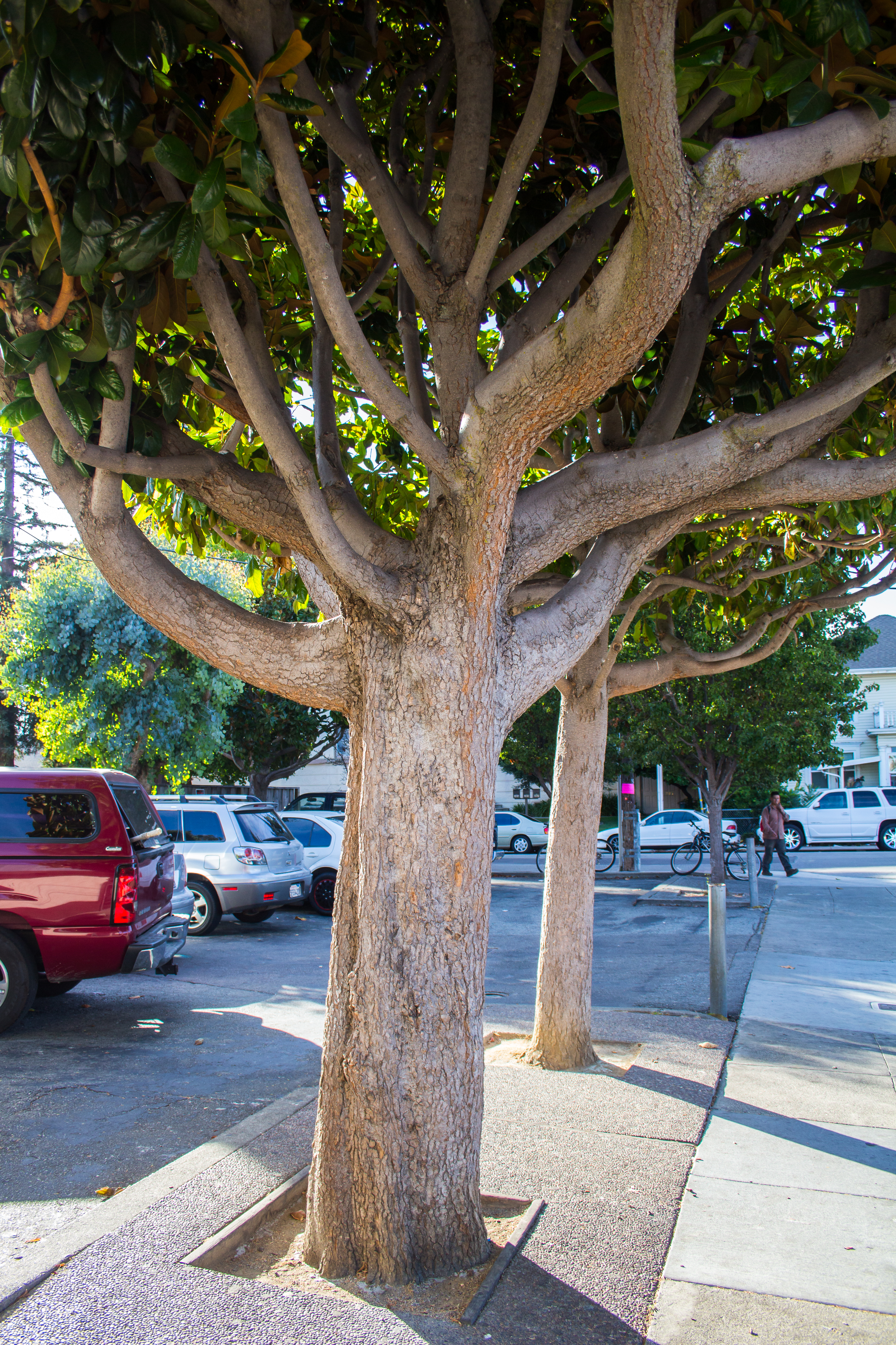 We learned from the city arborist that this magnolia was pruned incorrectly, exposing the bark to sun damage, so the squid is actually helping it this magnolia thrive! Next spring I expect to see a whole afro of white blossoms on top.