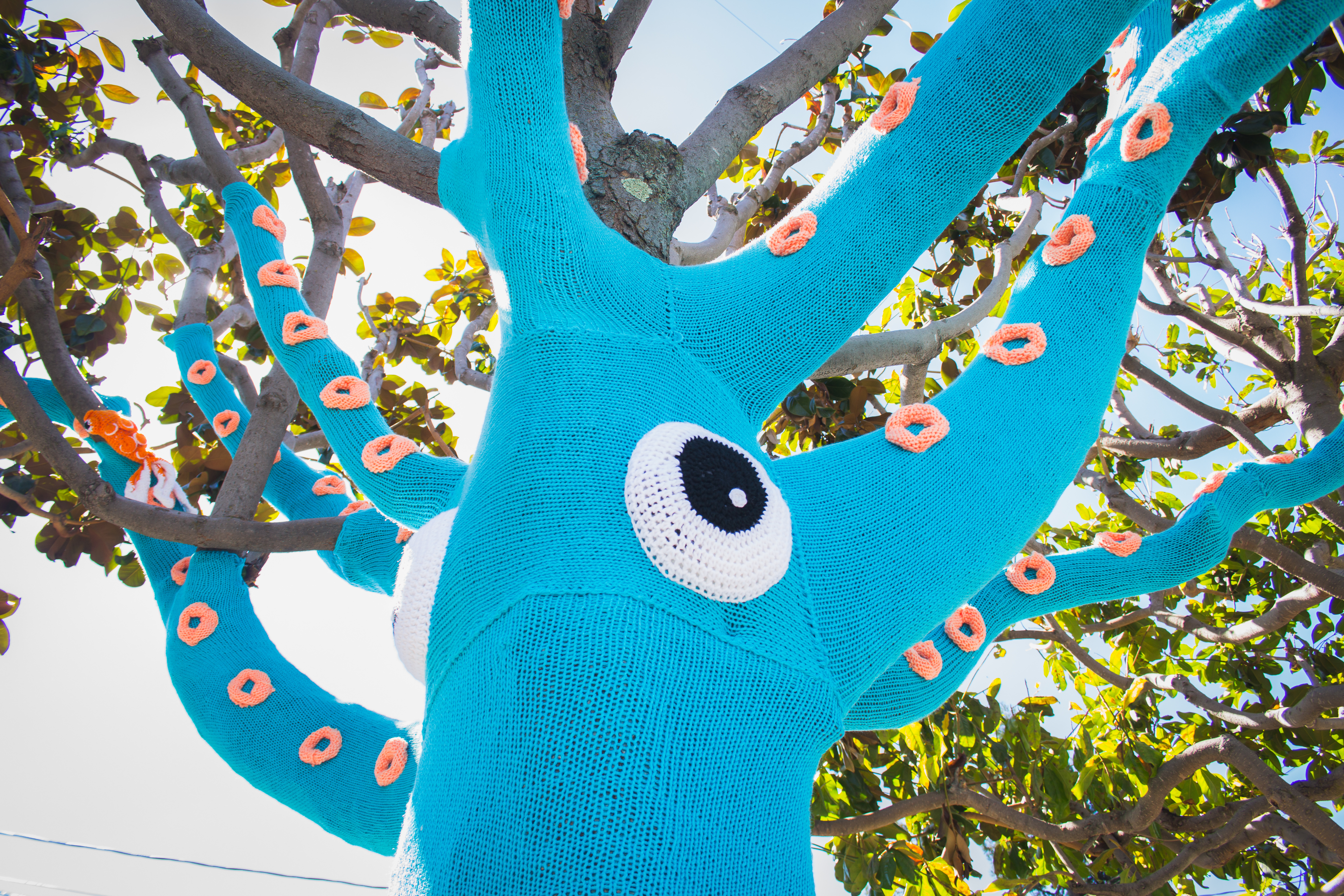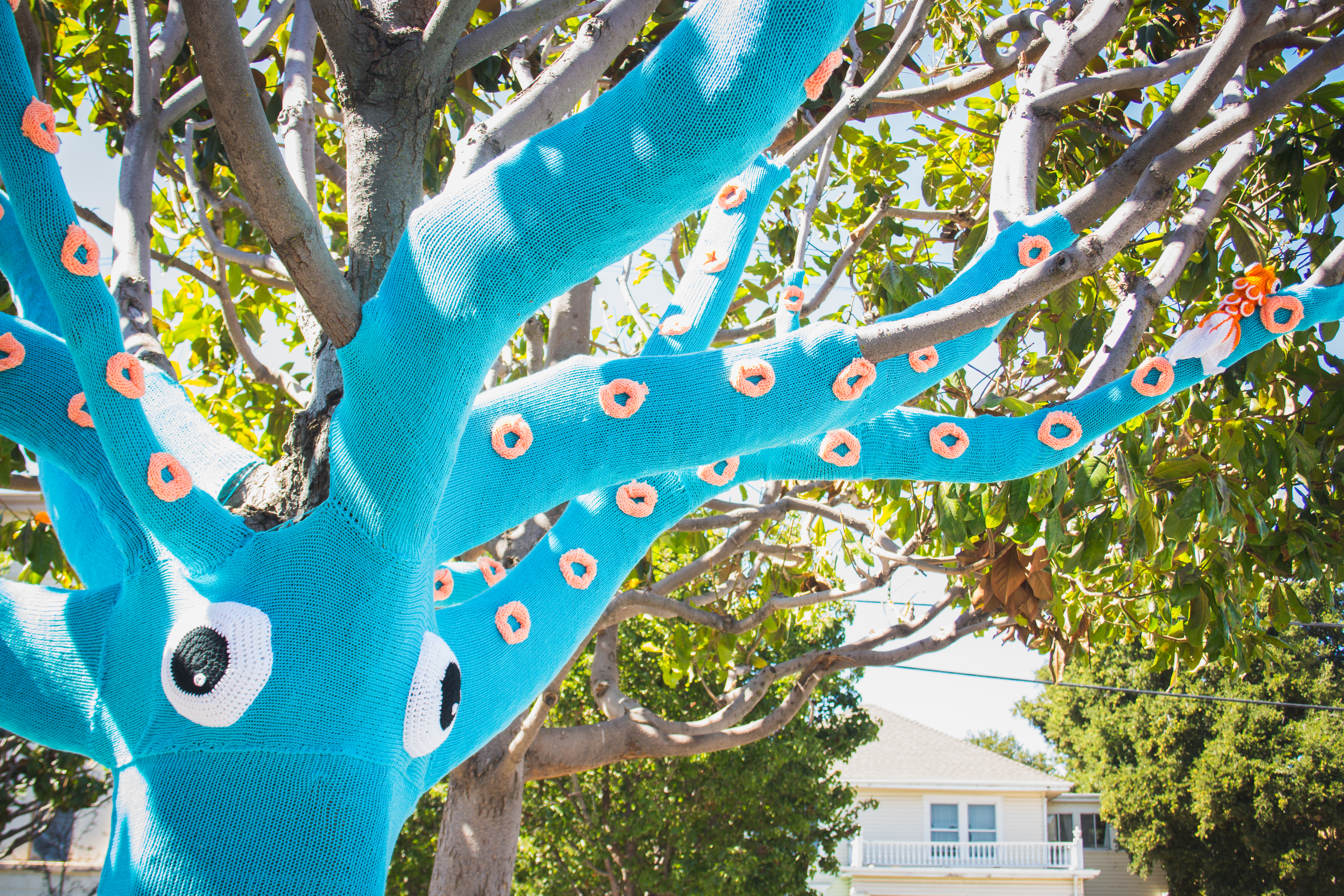 As the post explains, the owner loved having art on his property and the arborist told us it actually helps this magnolia. We always maintain out yarnbombs as they age and take them down when they are no longer beautifying. We’ll see how long this one lasts!