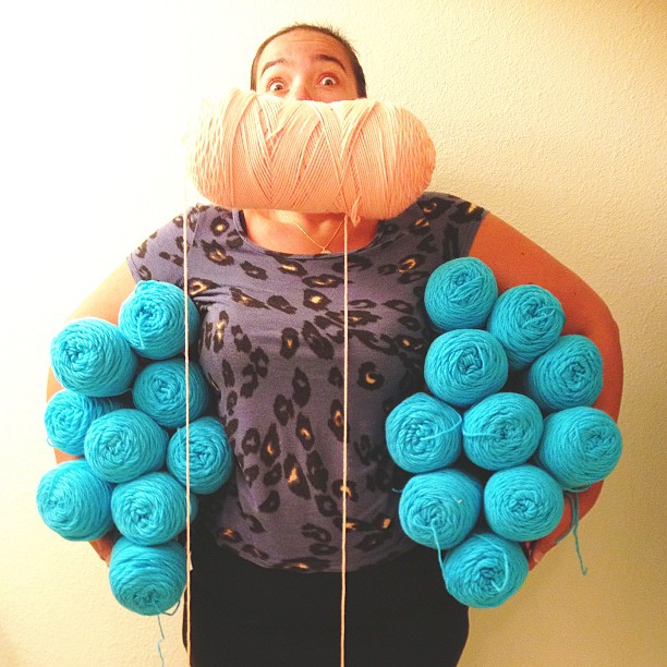 My knitting machine uses small weight yarn, but worsted weight yarn is faster and cheaper. In an amazing Craigslist score, my used machine came with a free Bond Ultimate Sweater Machine that uses worsted weight. Now, if only we knew how to use it. YouTube to the rescue! In just a couple days we mastered the Ultimate Sweater Machine. Here’s a little Vine video of setting up to knit: