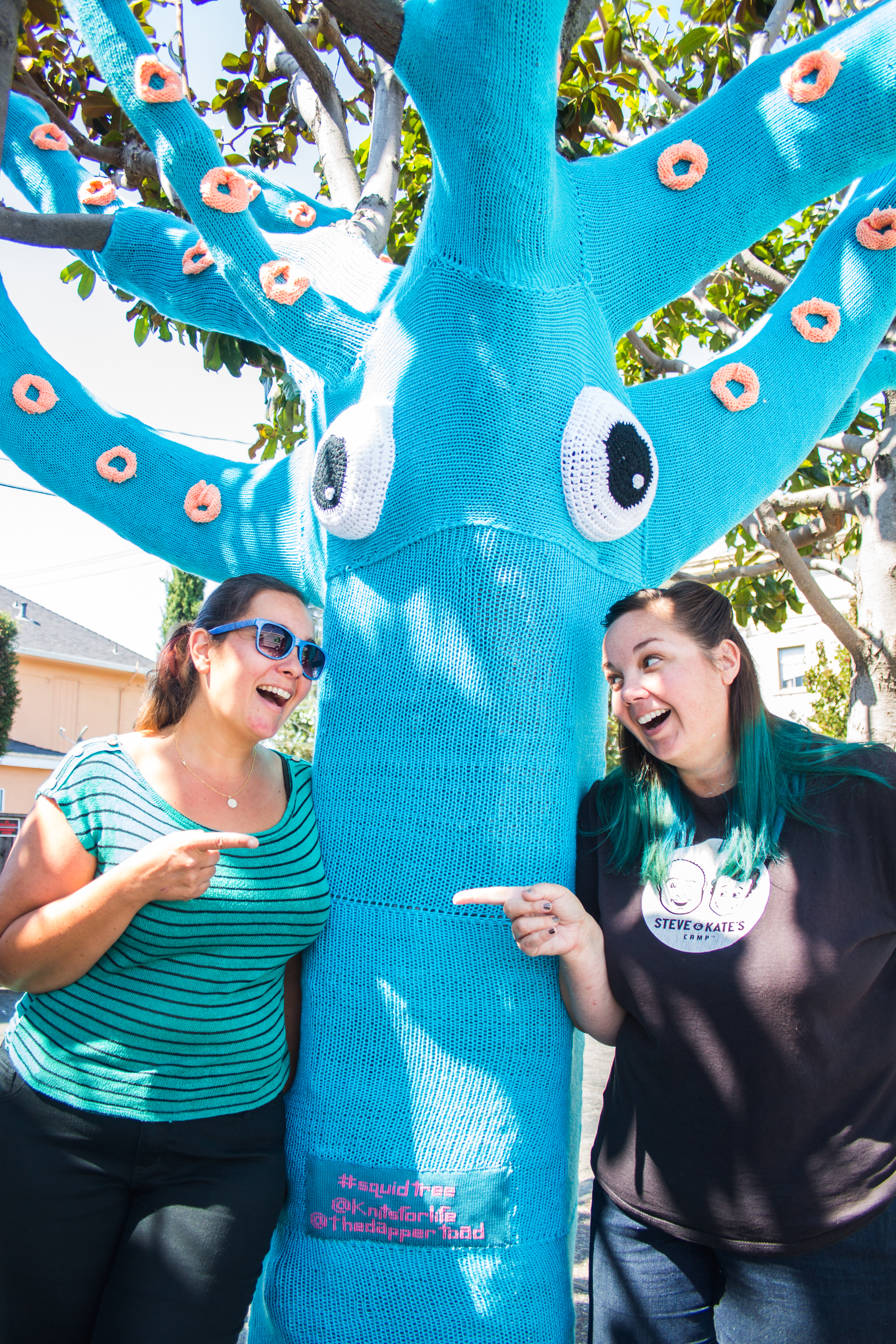 People on the street frequently asked how we conceptualized, measured, made the panels, and put it all together. For the benefit of all yarnbombers planning an installation, I’ll go into a little detail and include some tips. You can get tons of specific advice like this in ishknits’ Yarnbombing class, which I’m taking on Skillshare, and which you can take too (use this link to get a amazing deal). You can find more of Jill’s amazing photography of the #squidtree over at www.dappertoad.com.