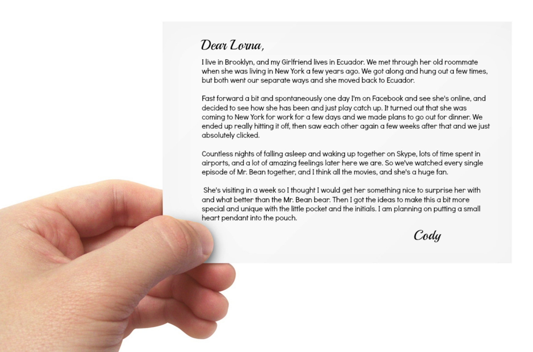 A dreamboat (surely) named Cody wanted to surprise his long-distance girlfriend with the bear from her favorite TV show for her birthday. Their story is so adorable and she is so lucky to have such a thoughtful, sneaky BF. We packed her bear with secret customized references to their relationship, which he dished all about to me.