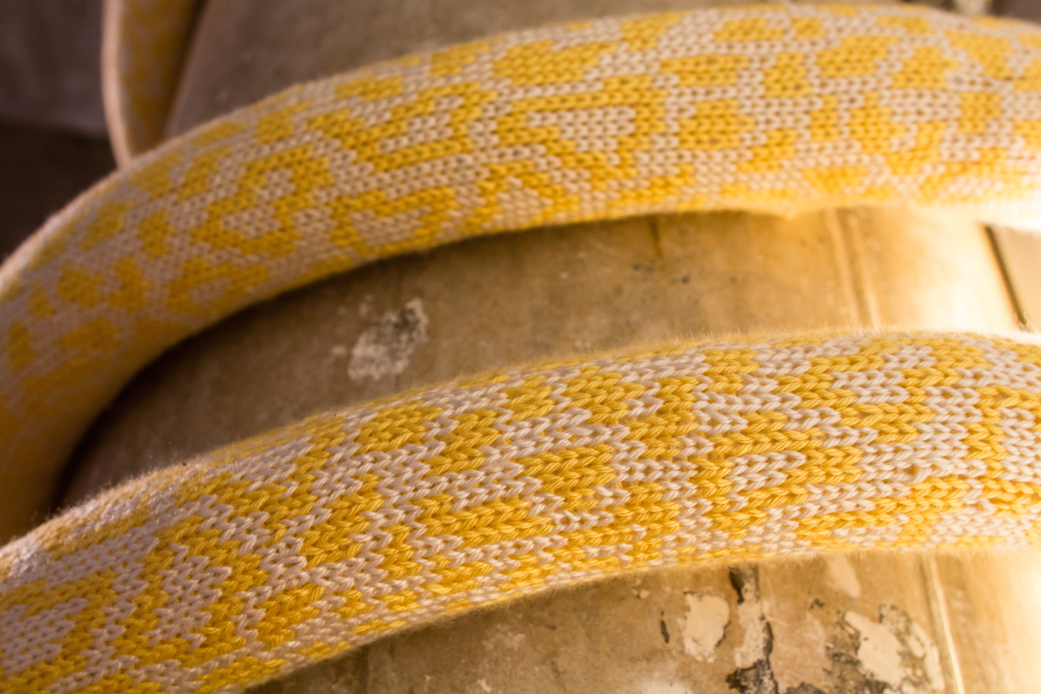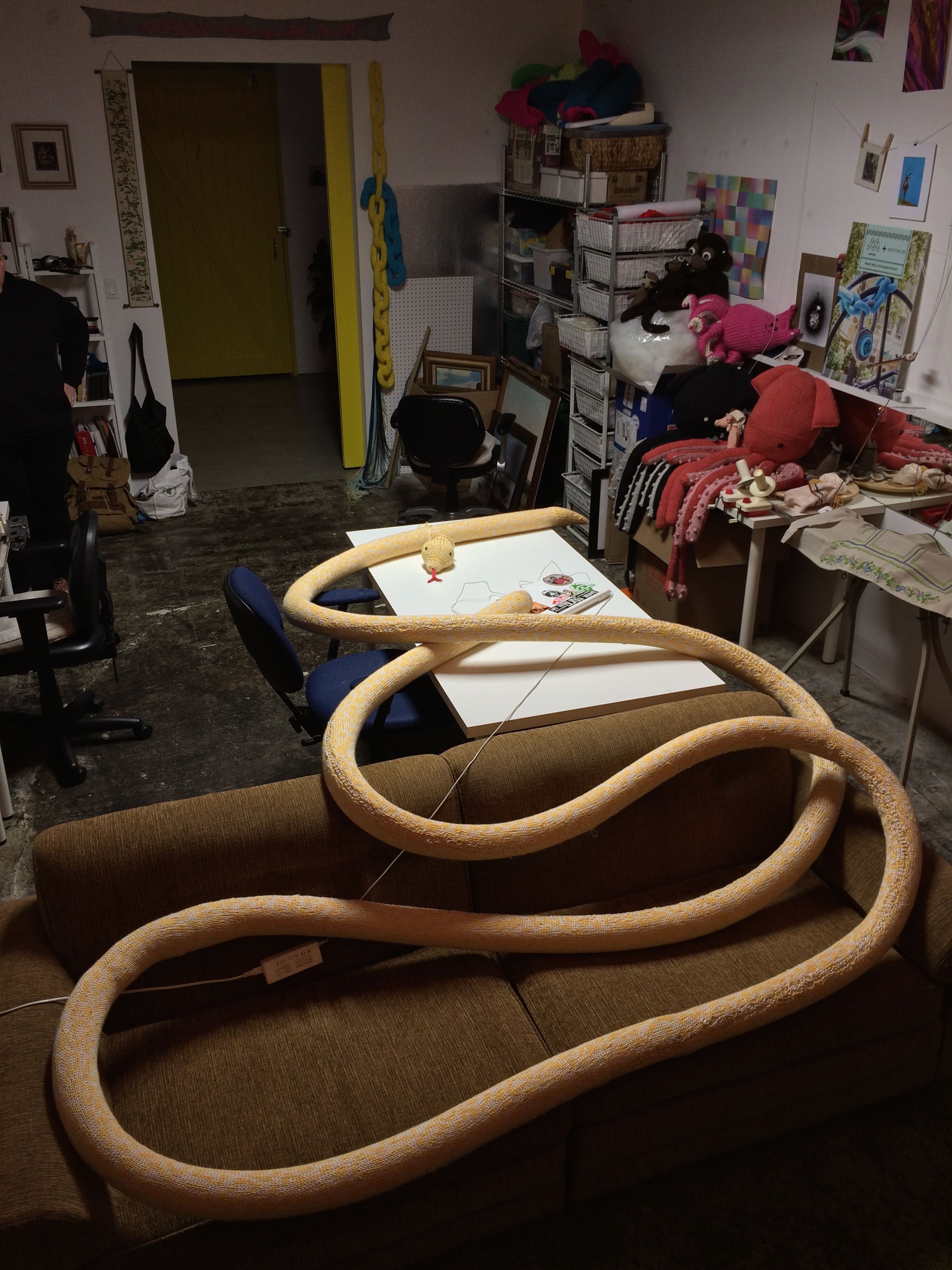 Once the chart is settled, the machine is hand-operated much like a loom. We took turns knitting 300 rows each for this 36 foot snake skin. For die-hards, you can find info about the yarn, colors, tension, and more on the project’s Ravelry page here.