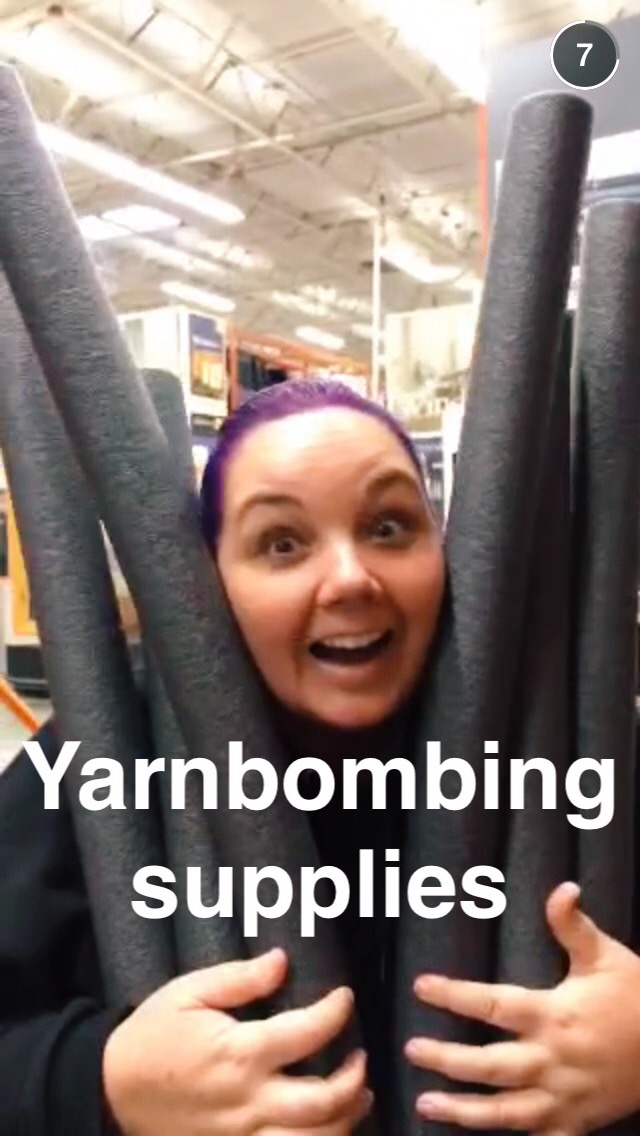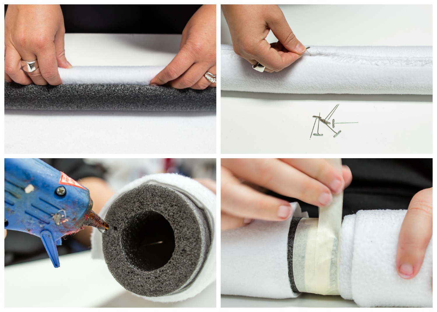 Most yarnbomb installations require us to engineer new techniques and materials to achieve the right look. This time instead of stuffing the snake, which can look lumpy and uneven, we opted for connecting six lengths of pipe insulation. In order to give the snake a nice white underlayer and some additional padding, we rolled each section in fleece fabric before connecting them with low-tech hot glue and masking tape.