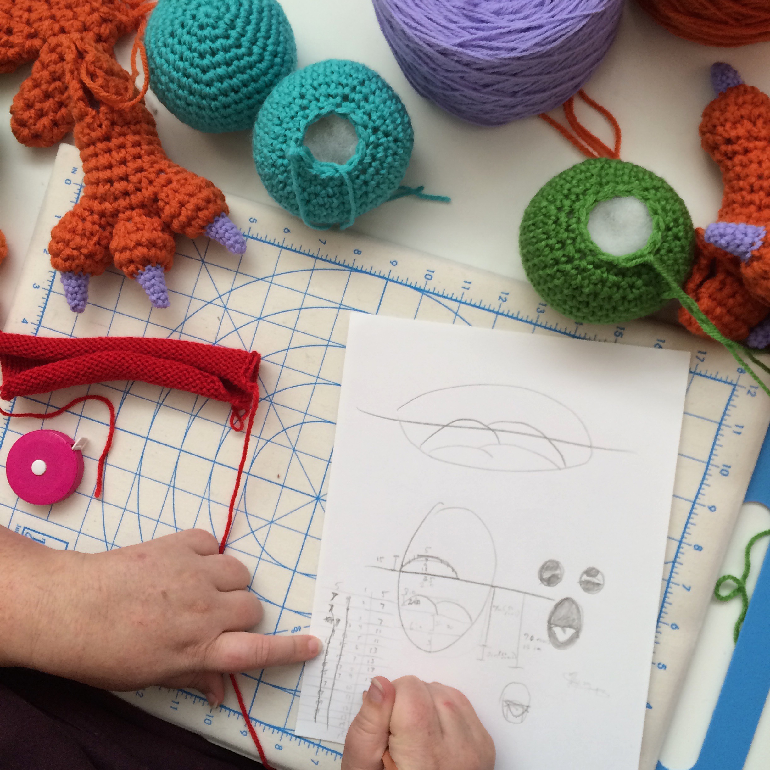 Our design reflects our belief in using the right tool for the job. This means that to construct a more sculptural element like feet or teeth, we hand crochet. To construct a crisp, flat panel, we knit on one of our vintage knitting machines, which we hand operate much like a loom. We design each element according to precise measurements based on hand made swatches using the perfect yarn and color from our huge palette. Finally, we painstakingly seam each element together on the chair with one of two different hand stitching methods to achieve an invisible seam.
