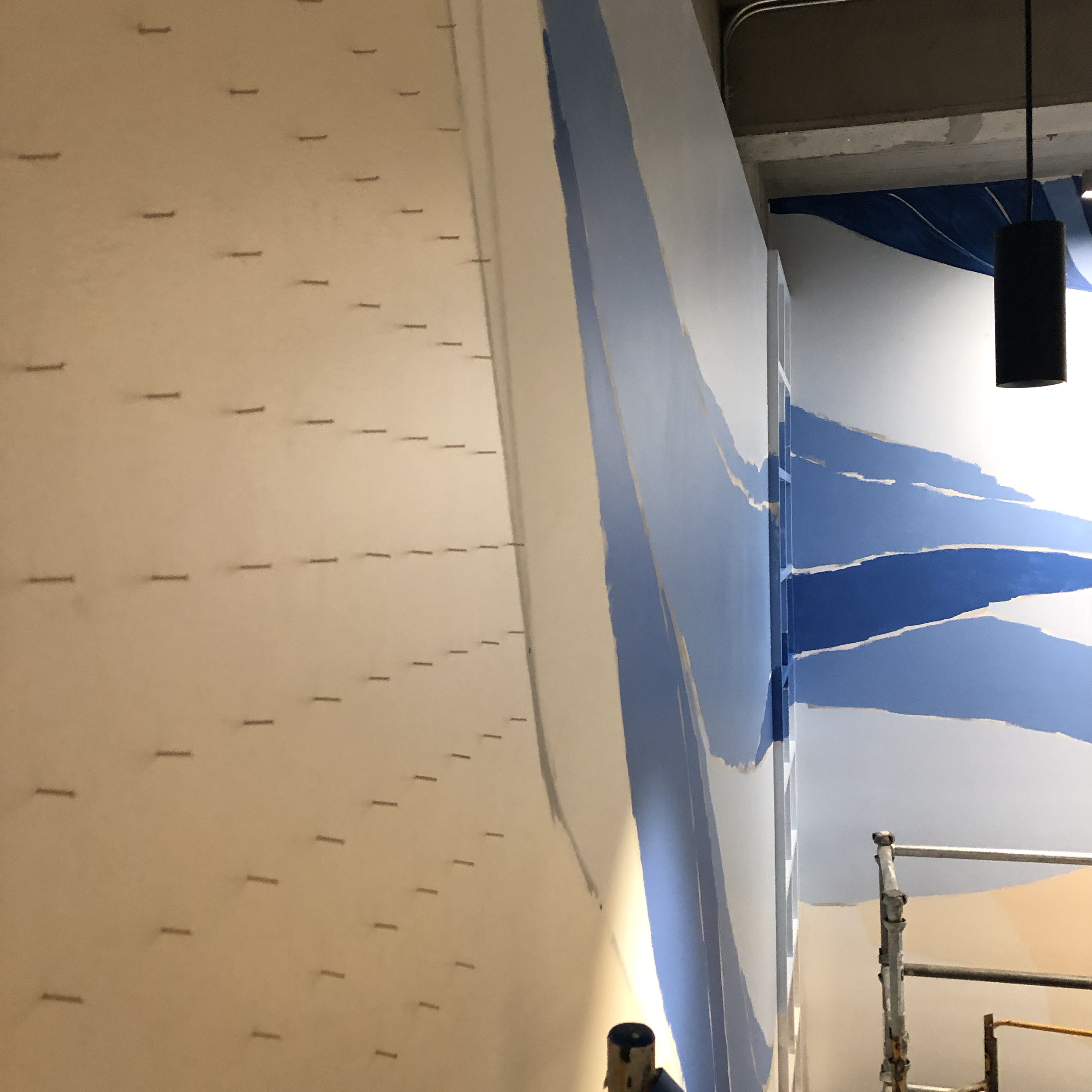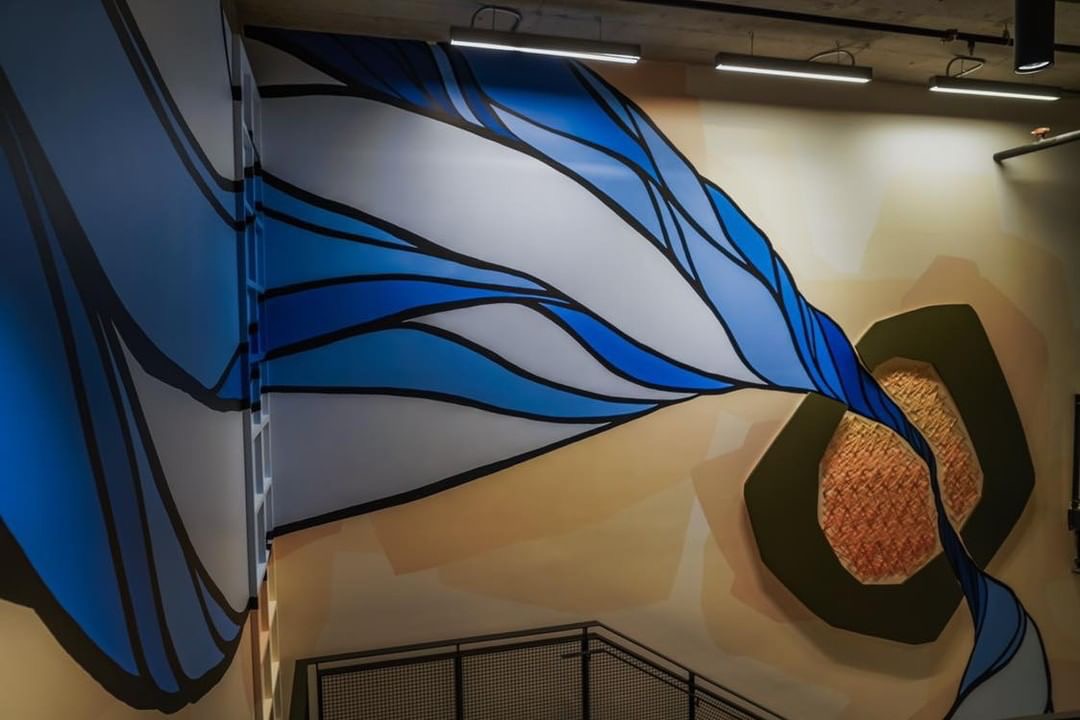 Mural collaboration by Strider Patton and Knits for Life at Atlassian’s San Francisco new headquarters, installed in November 2018.