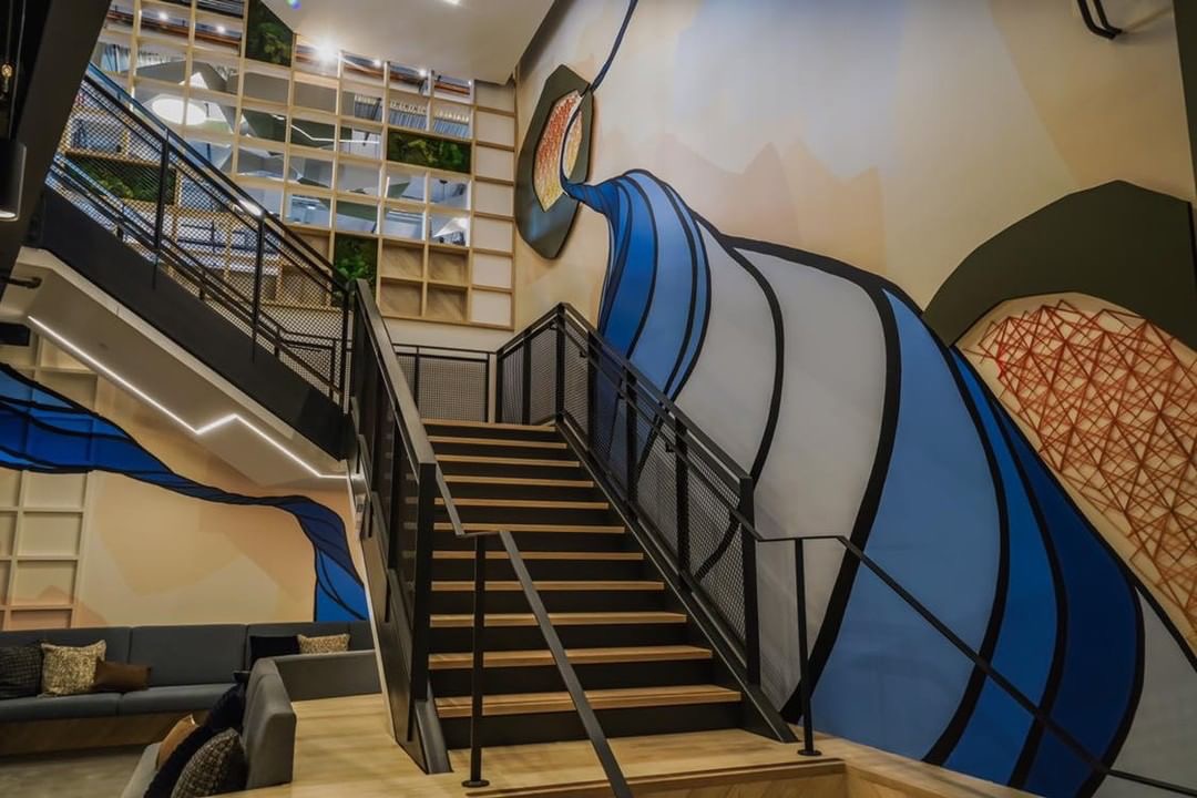This mural uses variety in form to tell a local story: Atlassian designed each of their six floors after a San Francisco neighborhood. Three stories tall, the mural serves to guide the viewer along the office’s focal staircase as they traverse the neighborhoods. Geometric and organic shapes, hard and soft materials, light and dark, warm and cool, the piece reflects the many sides of the Financial District, Golden Gate Park, and the Fillmore neighborhoods.