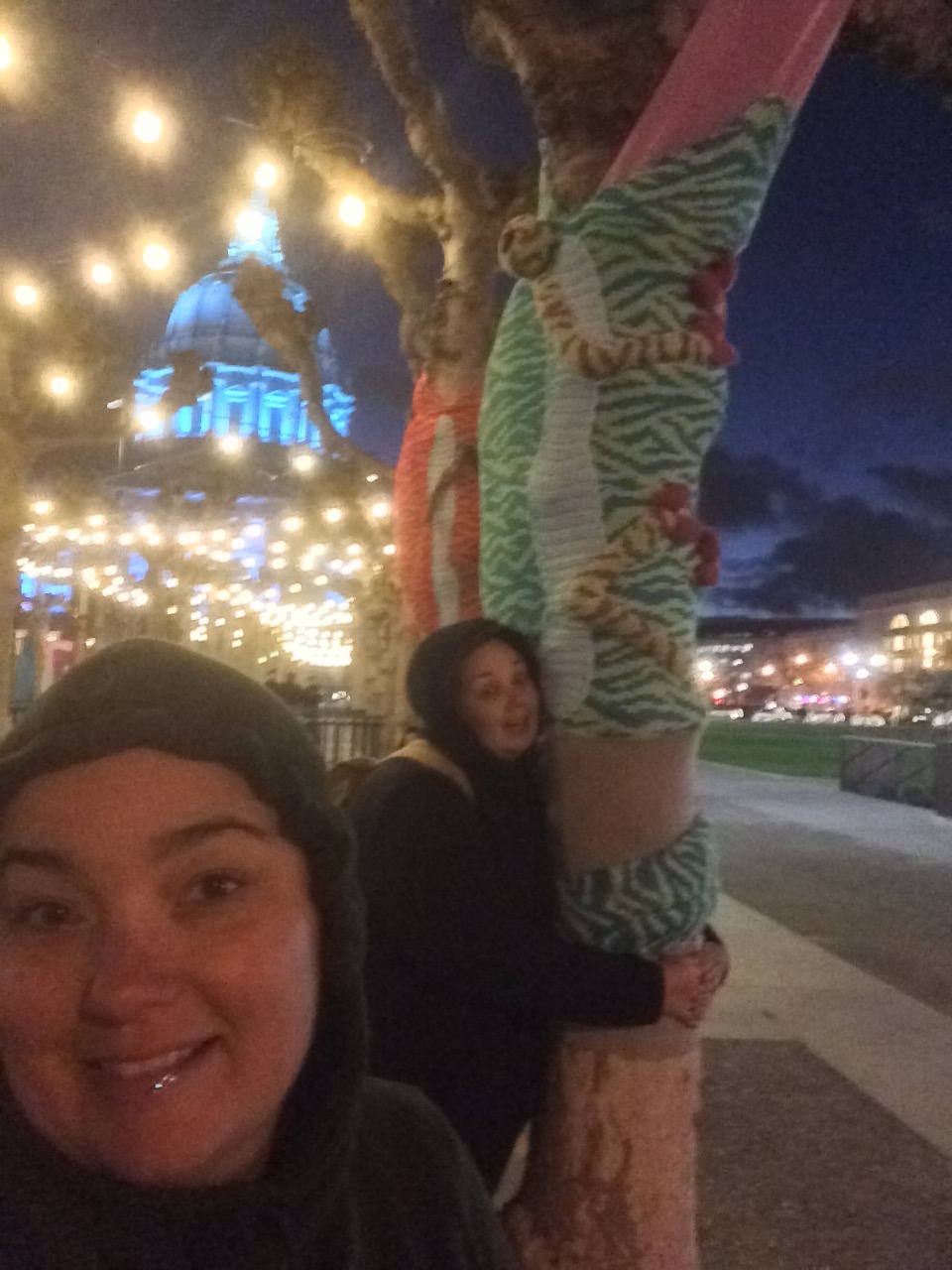 We yarn bombed two more clusters of sycamores in Civic Center Plaza, San Francisco as sea otters and chameleons for the Trust for Public Lands to celebrate the grand opening of the twin Helen Diller Playgrounds. This brings the menagerie to five different animals and 13 trees in total, not including the 60+ colorful bands we did as a trial balloon.