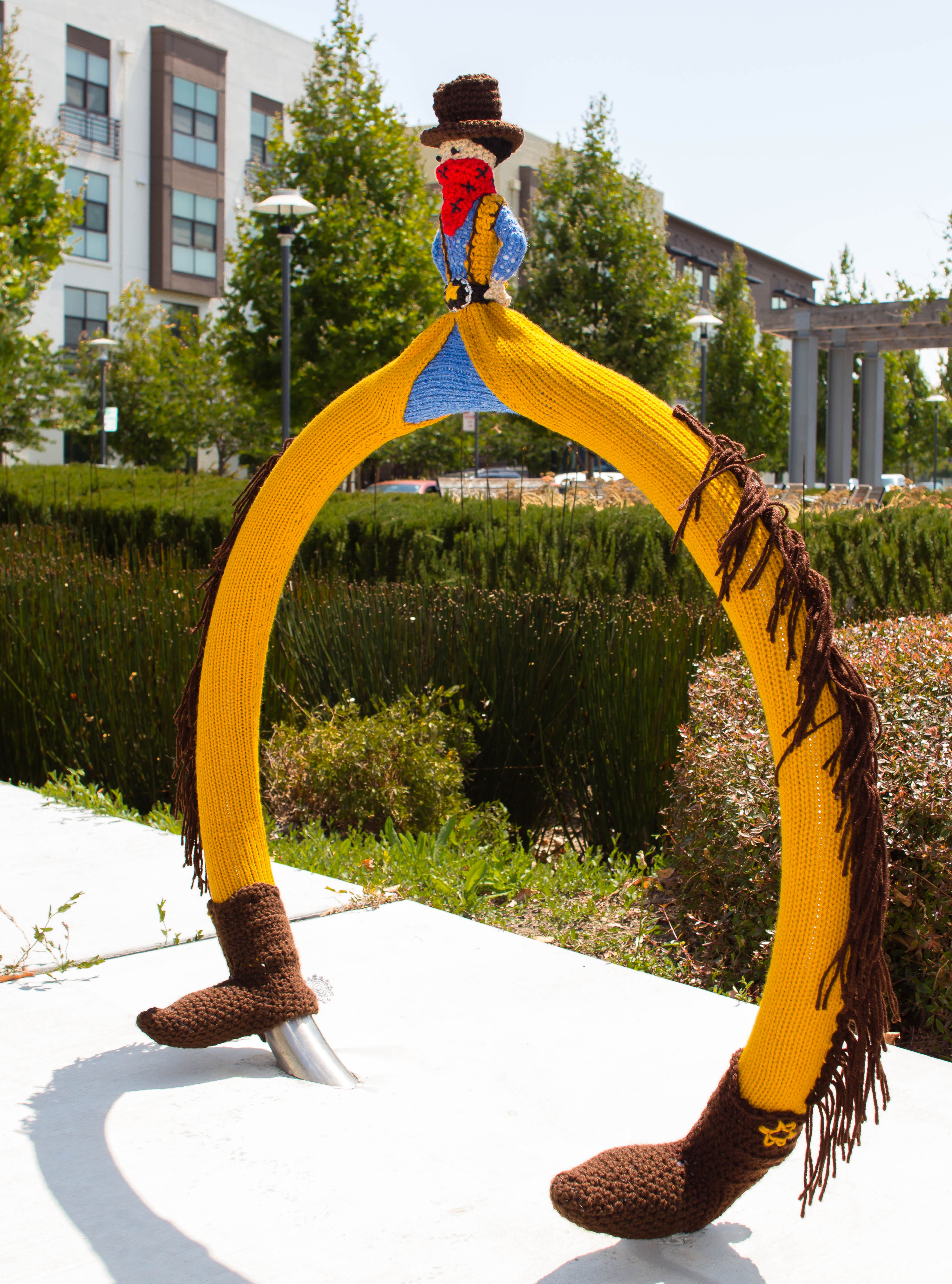 Original cowboy design and hand made yarn bomb installed on a bike rack at Landing Green Park, Bay Meadows, San Mateo, CA.