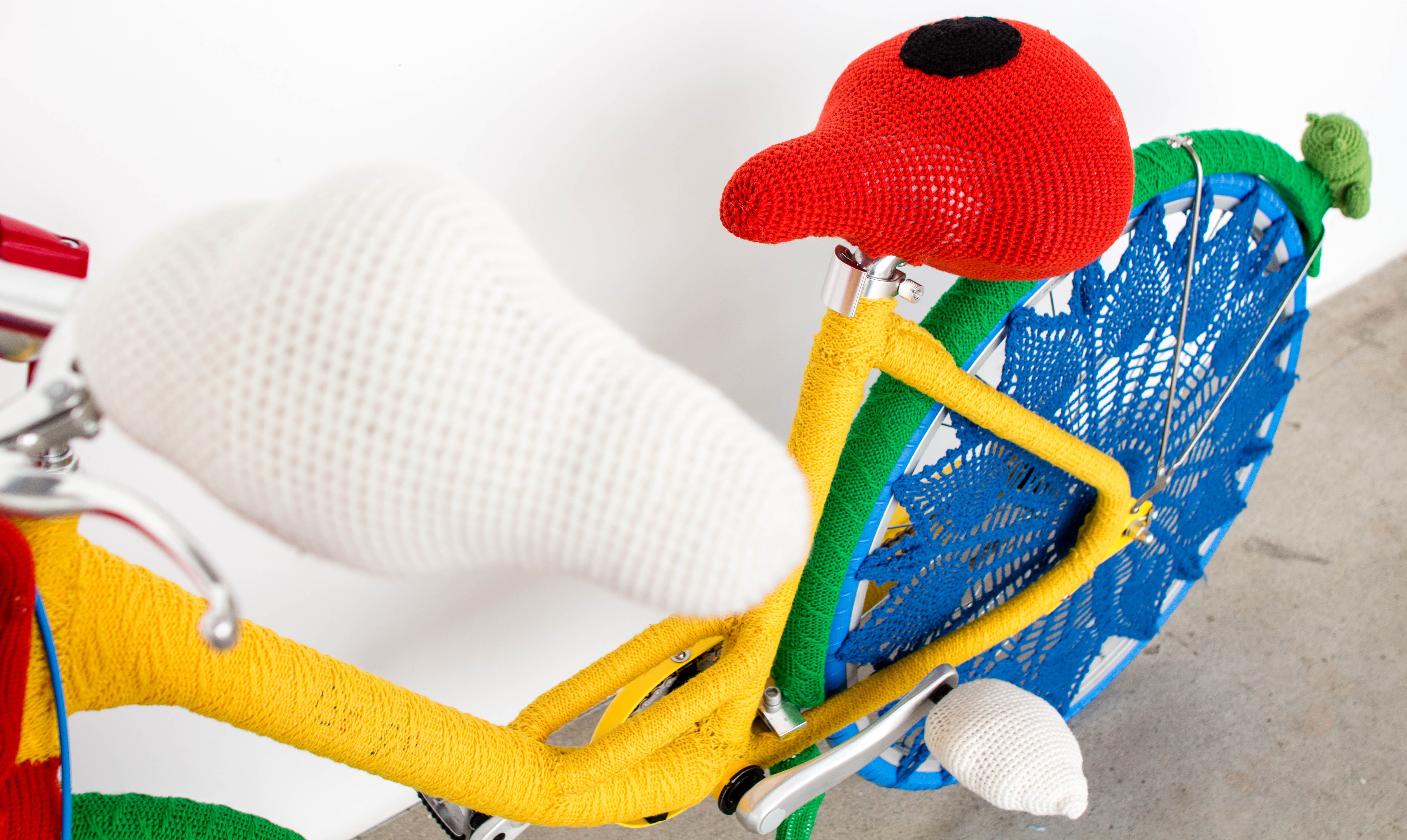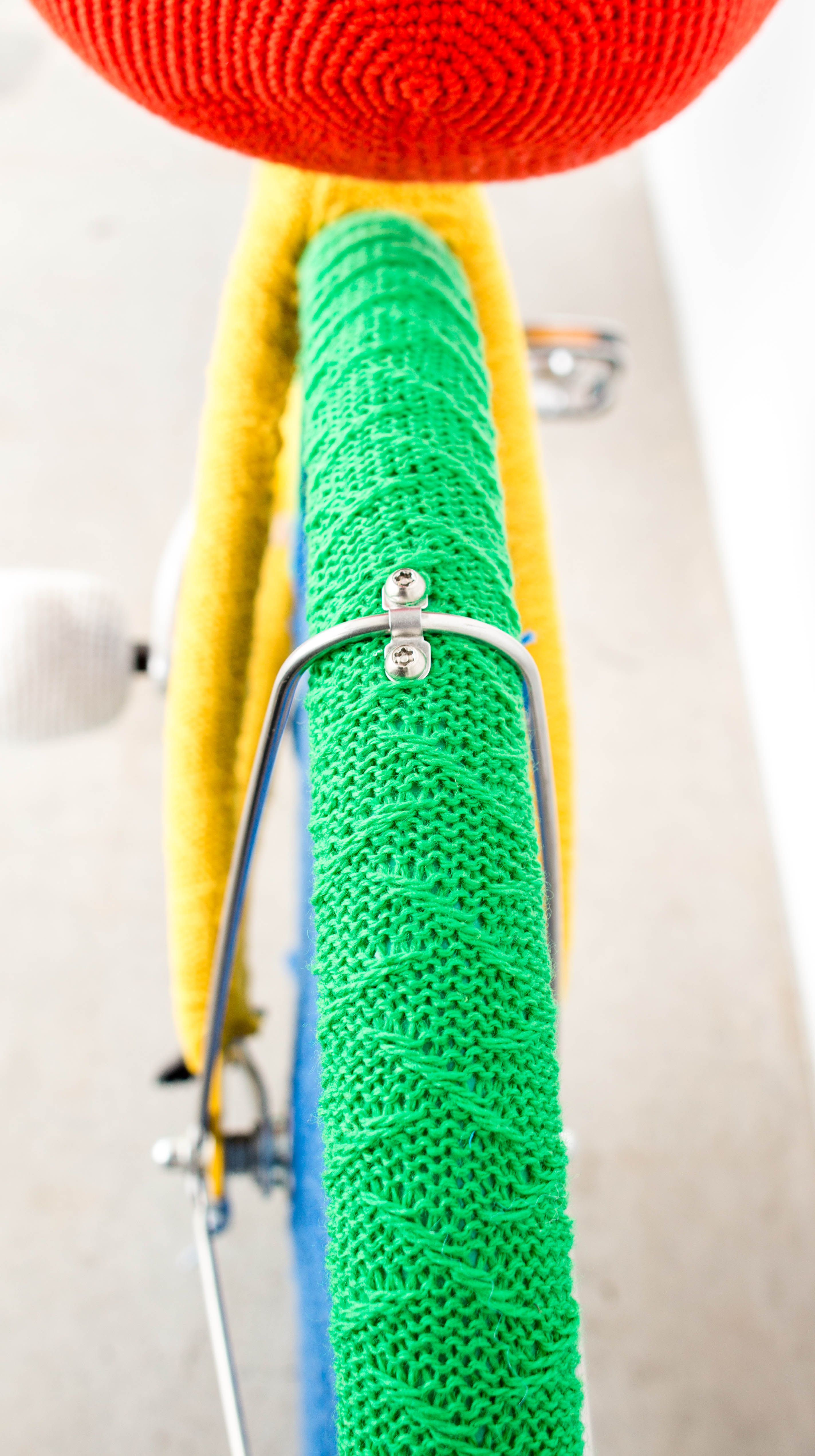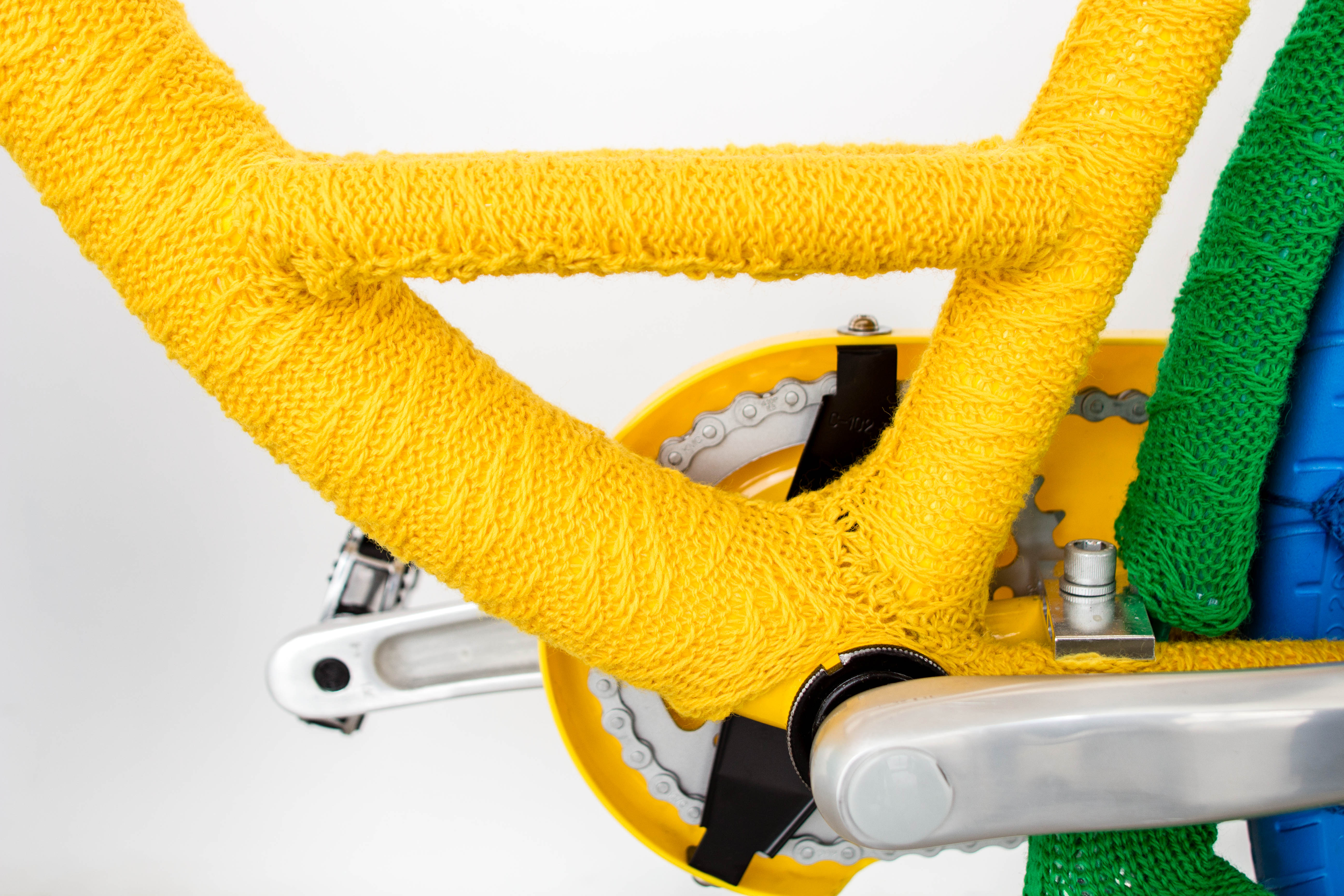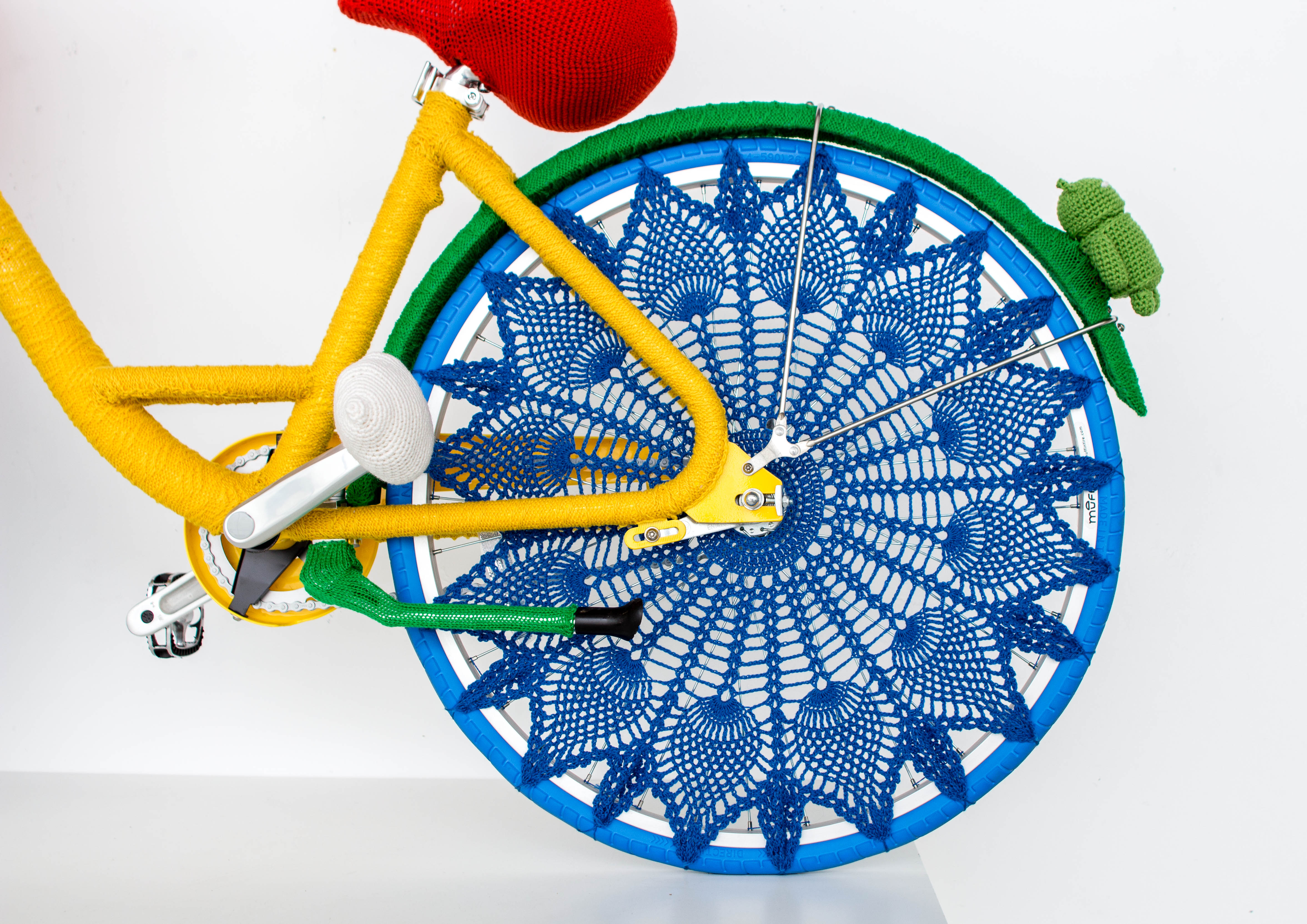 Hand knitted and crocheted elements, hand sewed onto bikes.