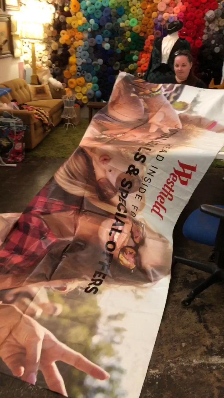 Our task was to create a focal point using a sustainable material in line with the event’s sustainable ethos, which excluded new plastic serveware, serving meat, and more. After researching recycled yarn and textiles, the idea sparked to repurpose used local billboards from California.