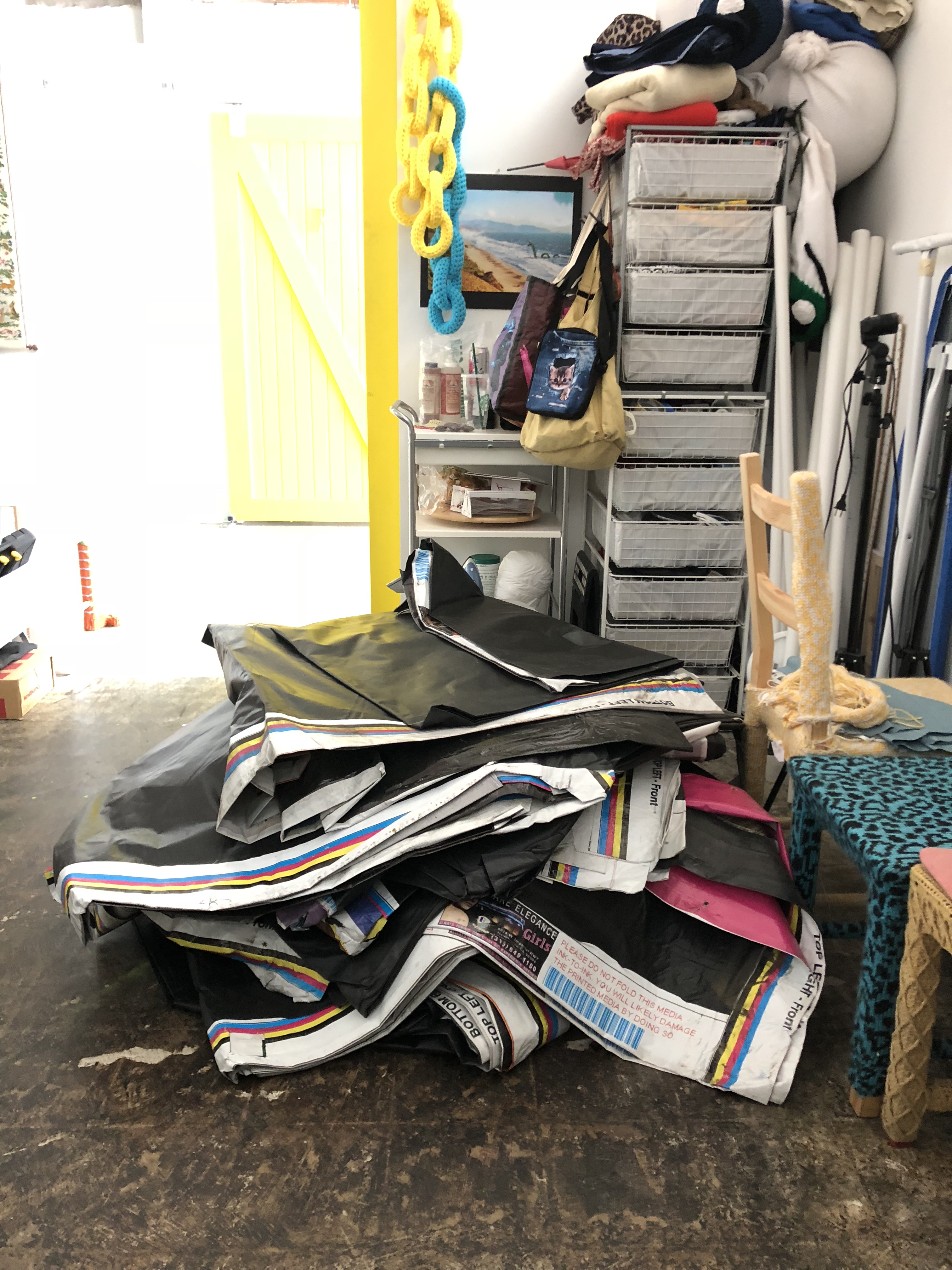 Constructed as four 10- x 10-foot panels on 1.5-inch PVC pipe “knitting needles”, we keep them in the studio to reuse for jumbo knitting projects.