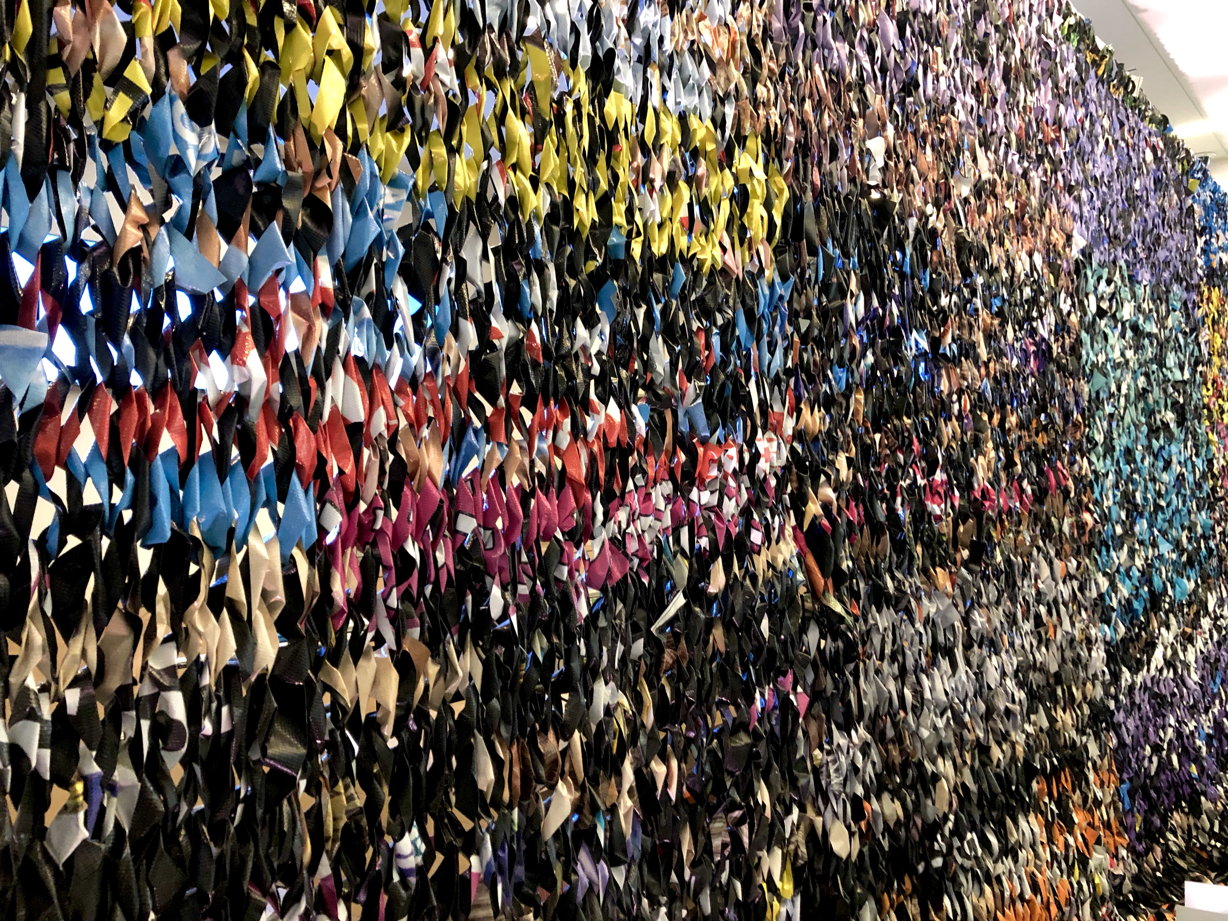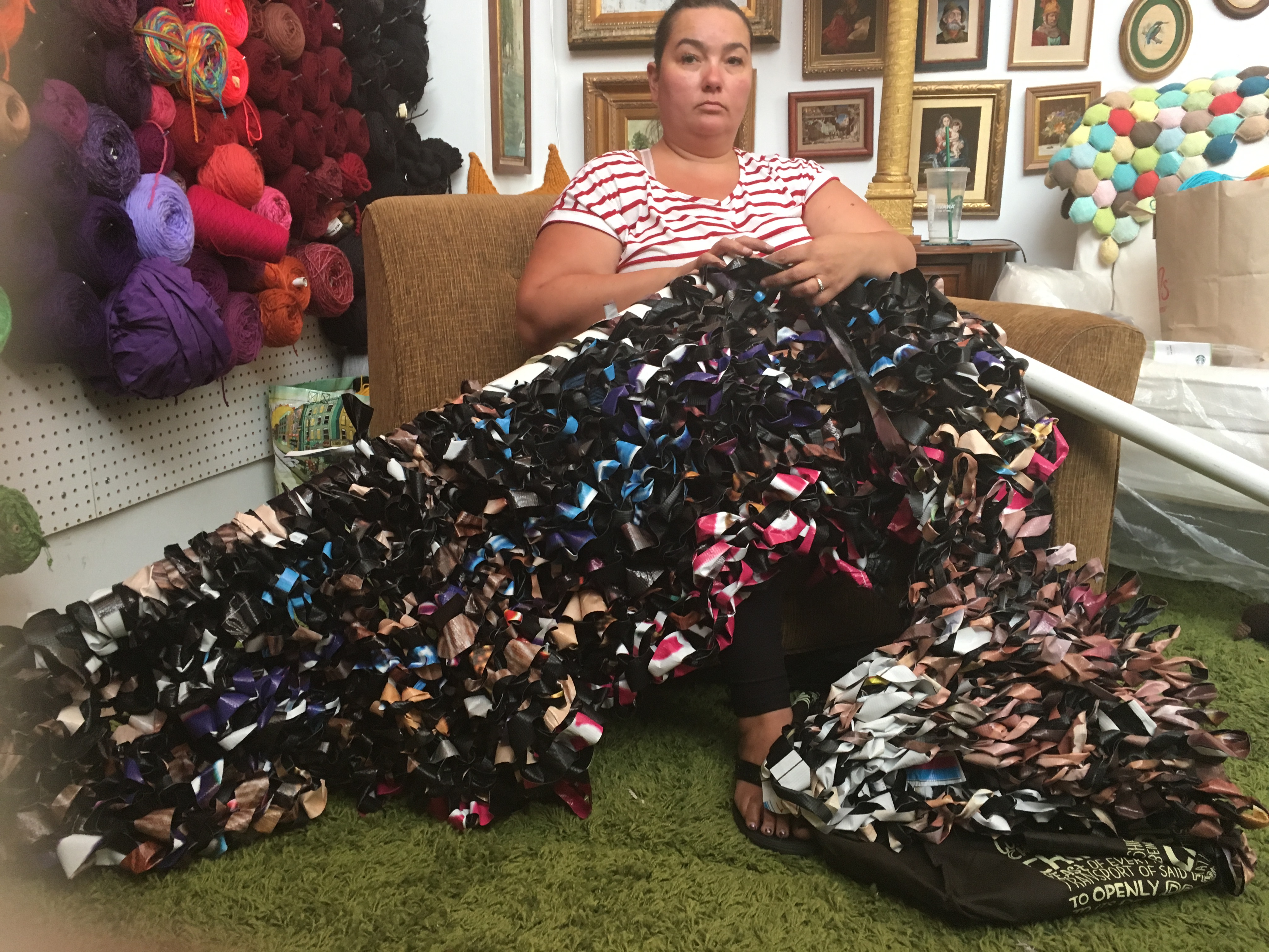 We hand cut over two dozen 6- x 12-foot billboards into 1.5″ strips using the technique we developed for cutting fabric into one long, knot-free strip. That’s over half a mile of strips!