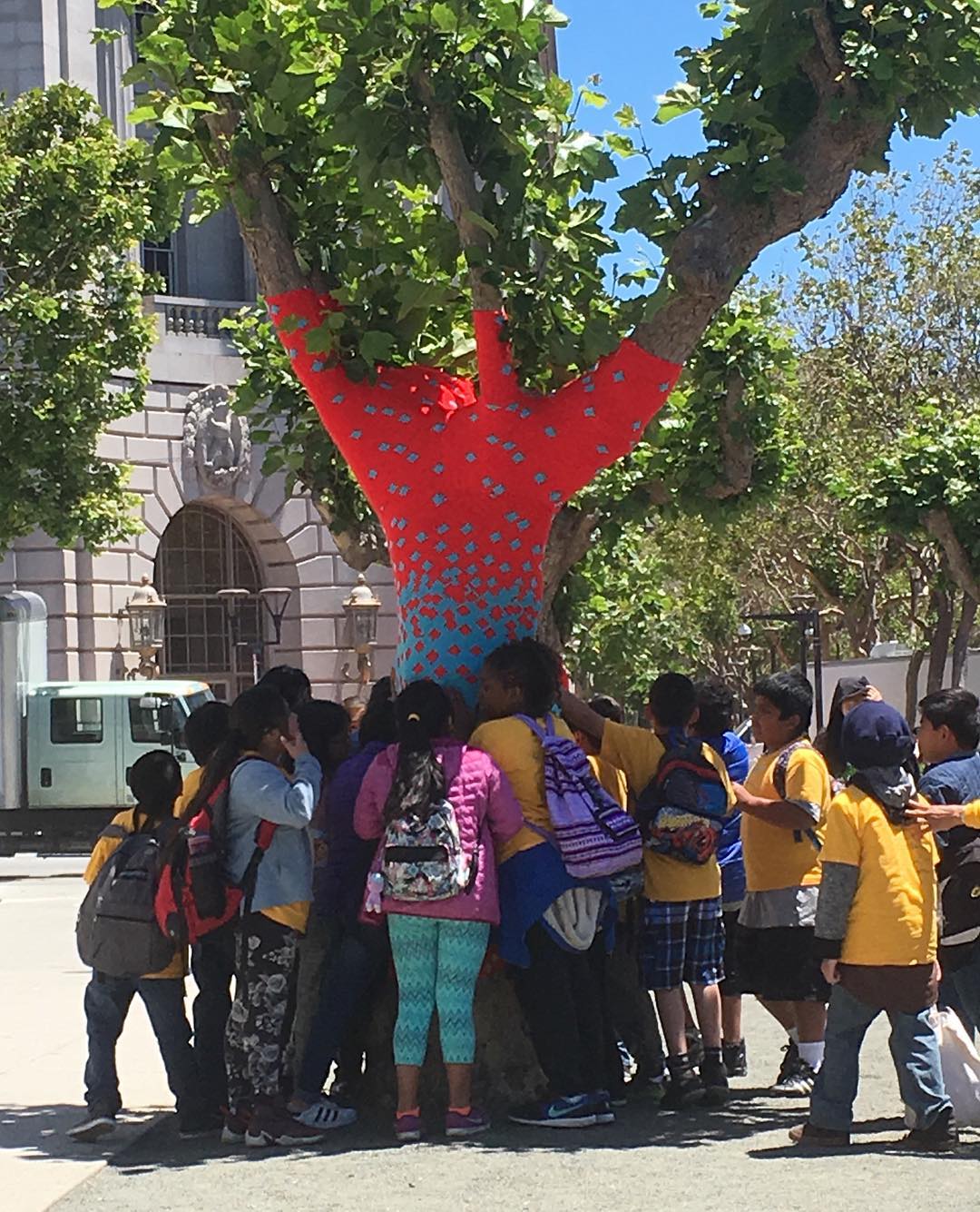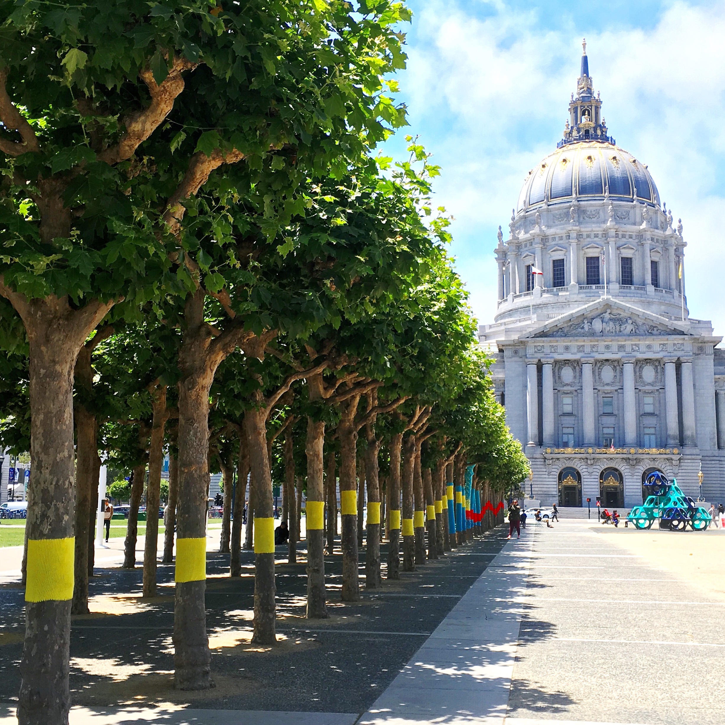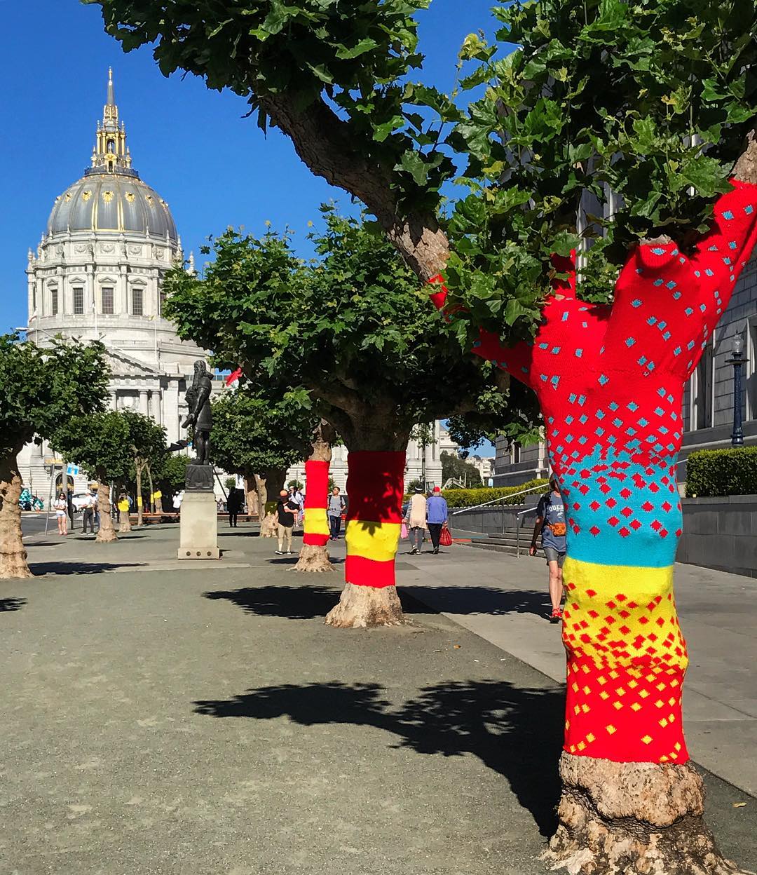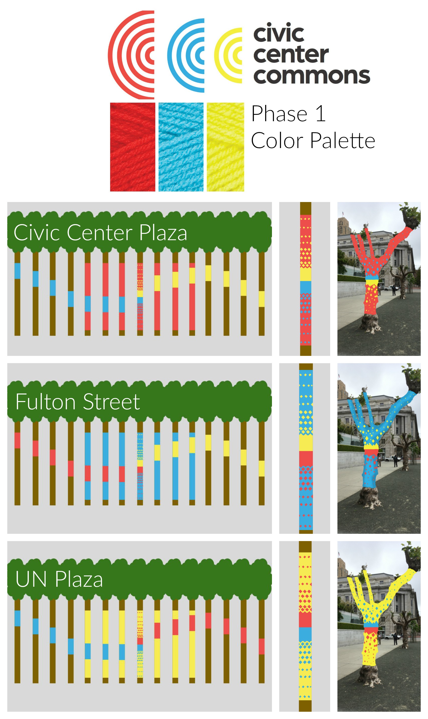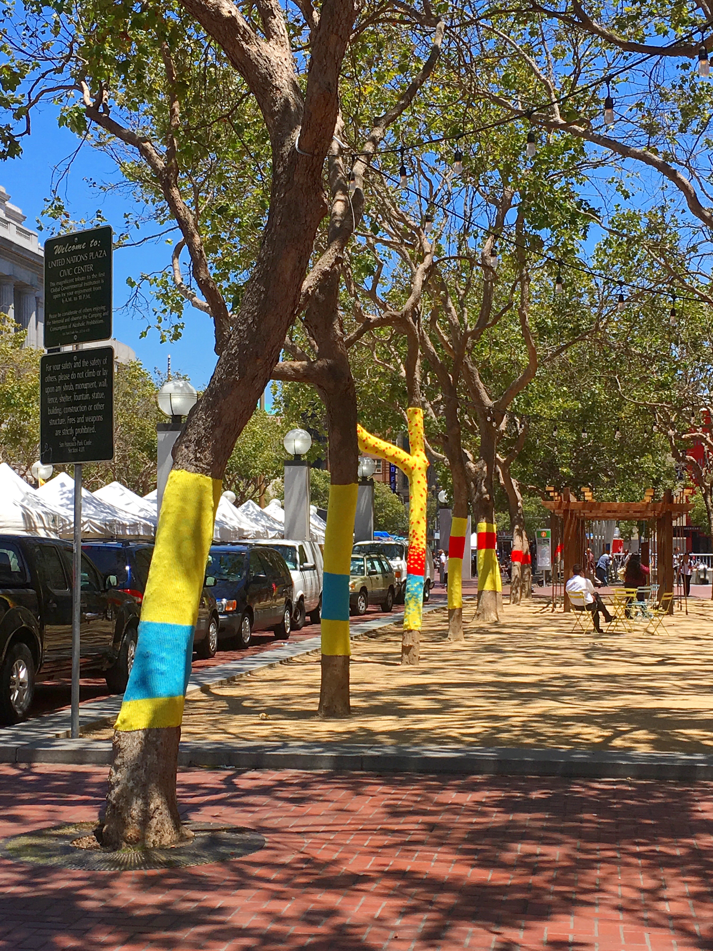 Knitting the Commons is a temporary art project that aims to ‘knit’ together over 80 trees throughout the Civic Center Commons (the Commons) in San Francisco, California. The Commons is the new name for the three blocks between San Francisco City Hall and Market Street, including Civic Center Plaza and United Nations (UN) Plaza.