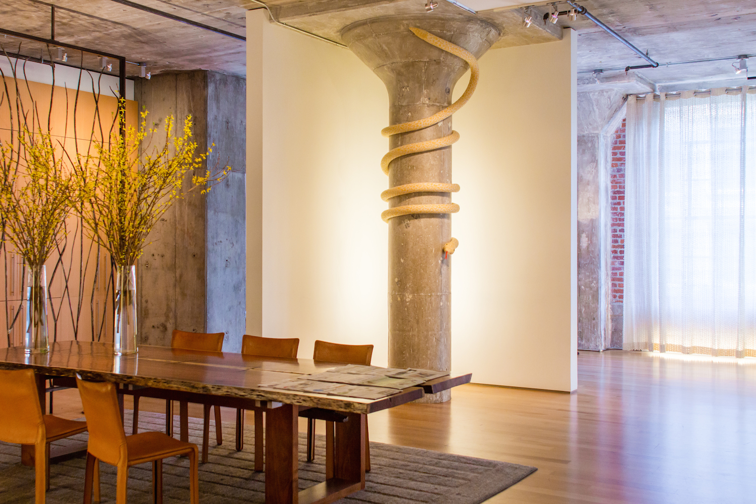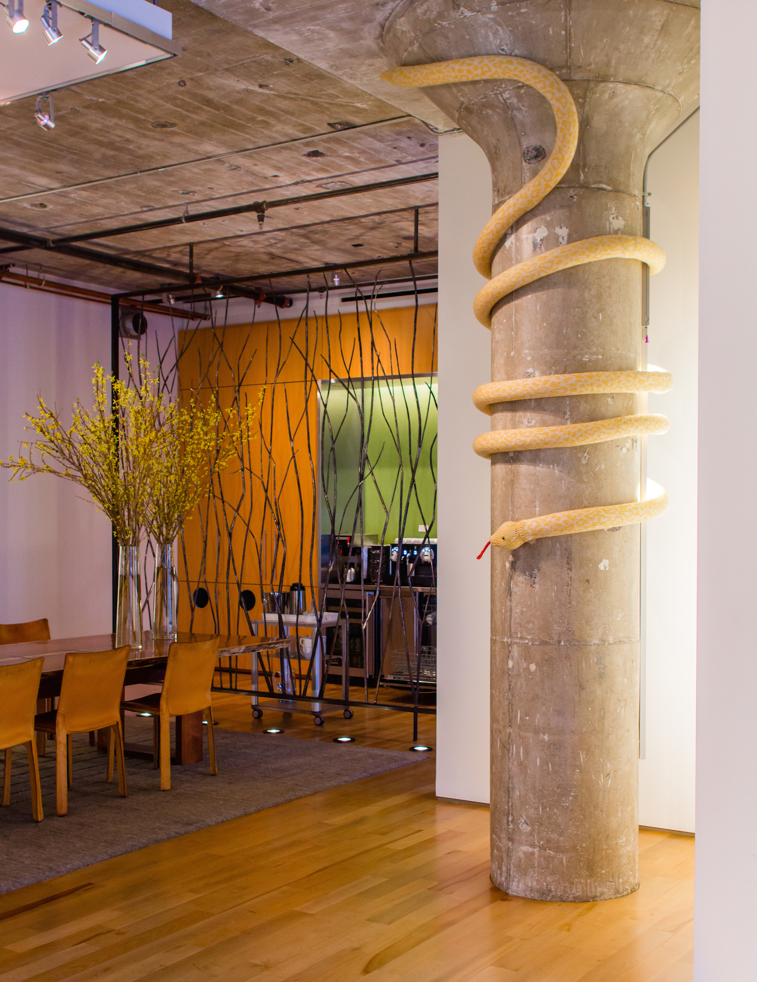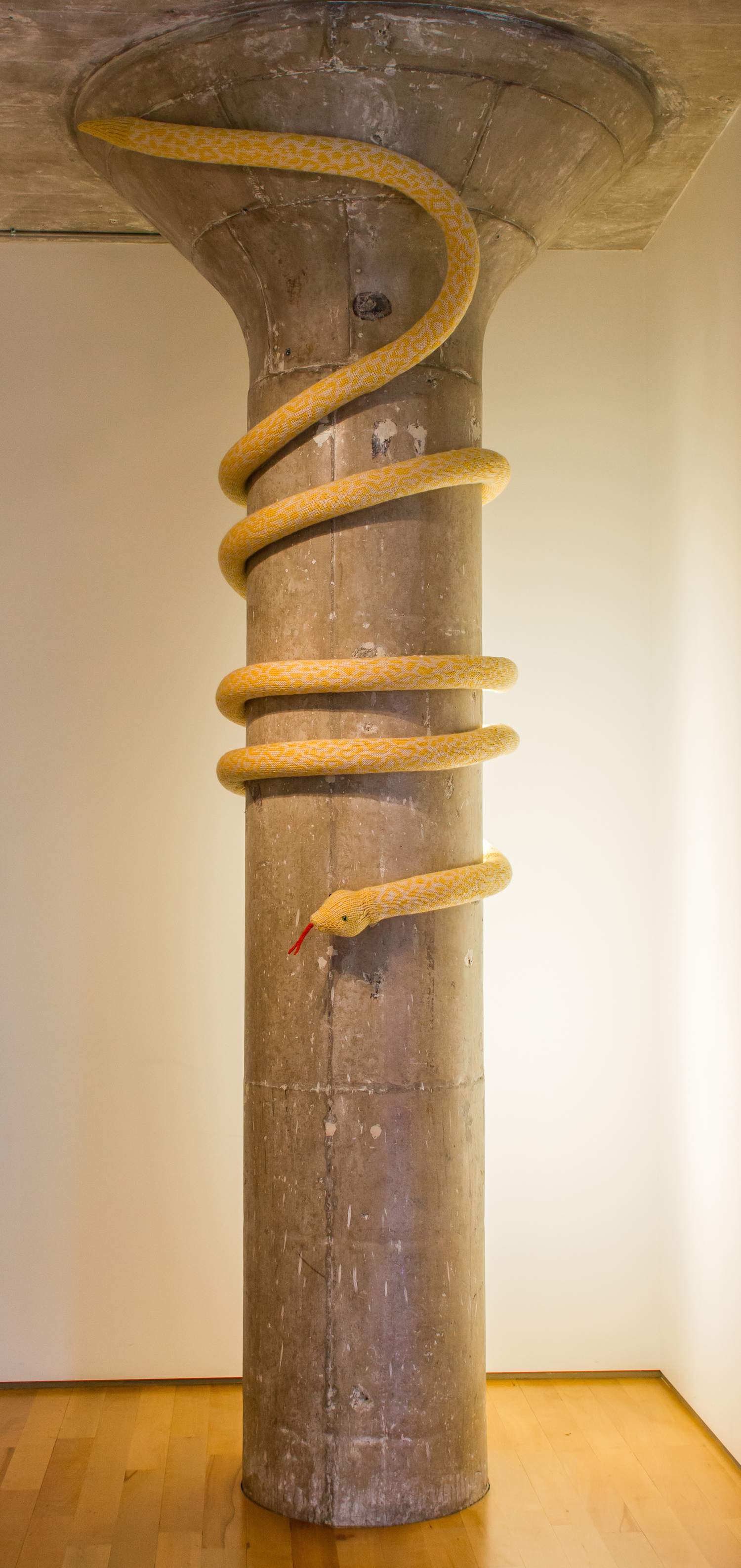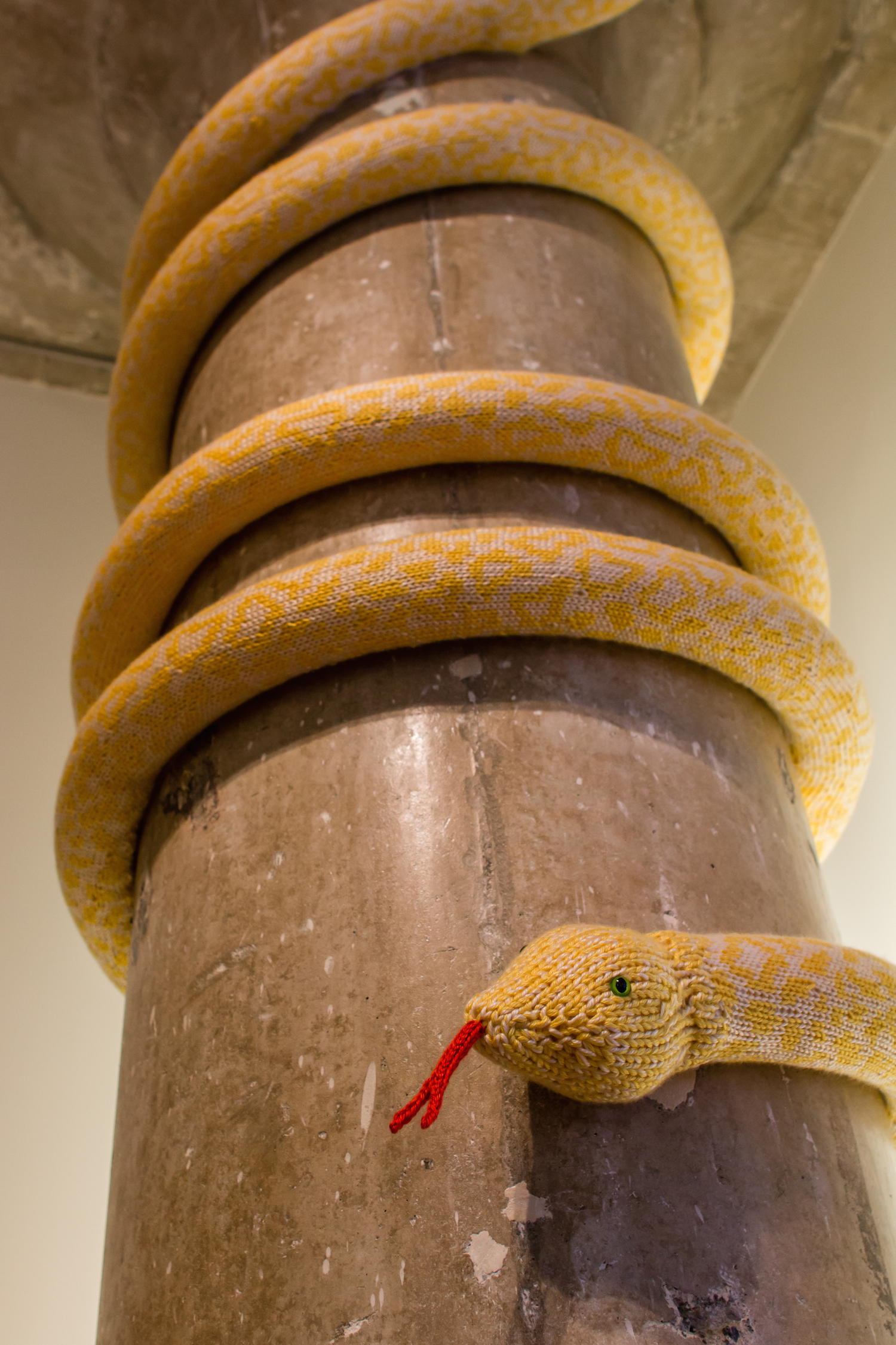 Mort, a knit albino Burmese Python yarnbomb installation at Gensler Architecture and Design’s San Francisco headquarters. For Gensler’s fiber art show Naught February 12 – May 12, 2015.