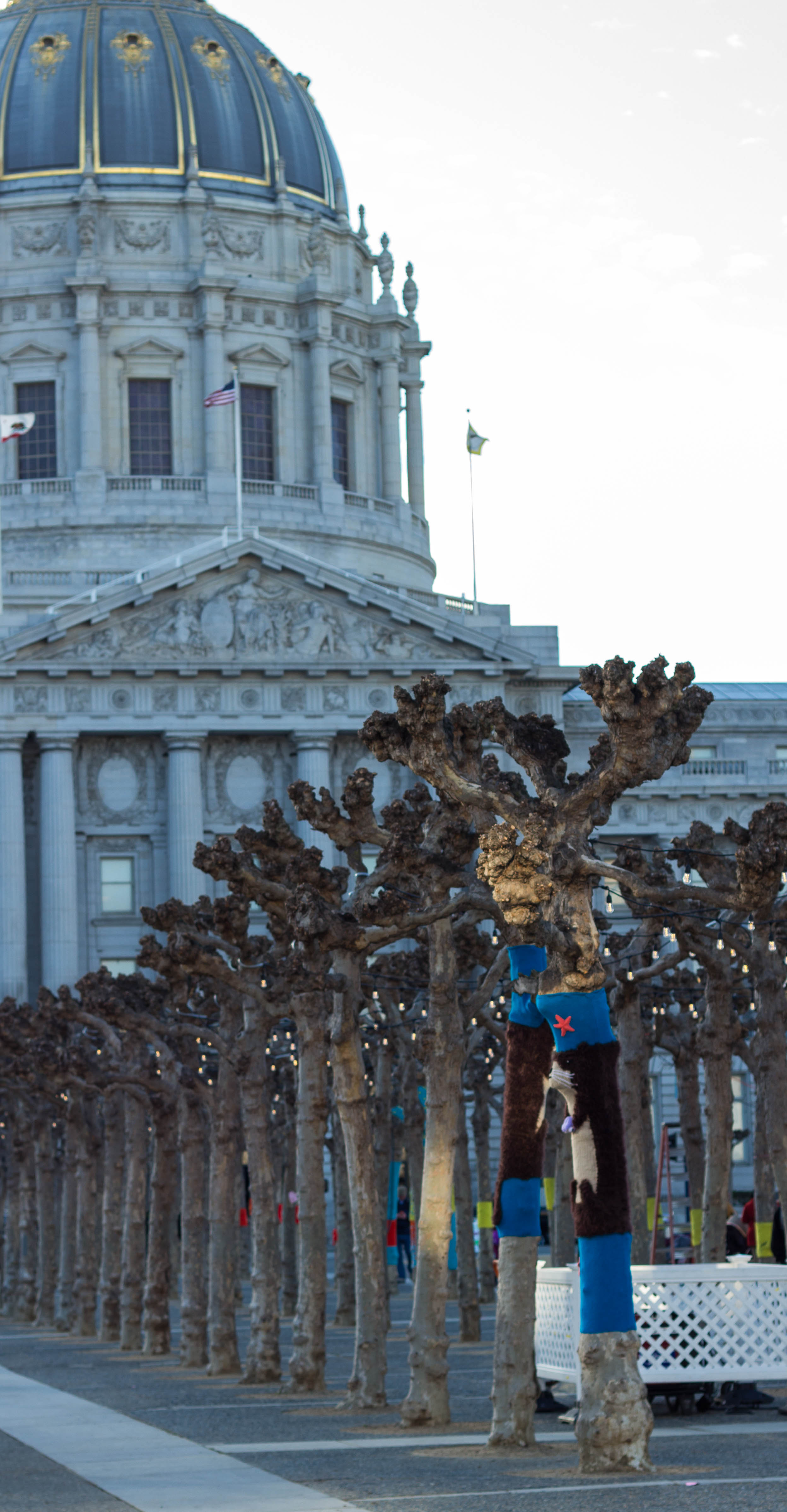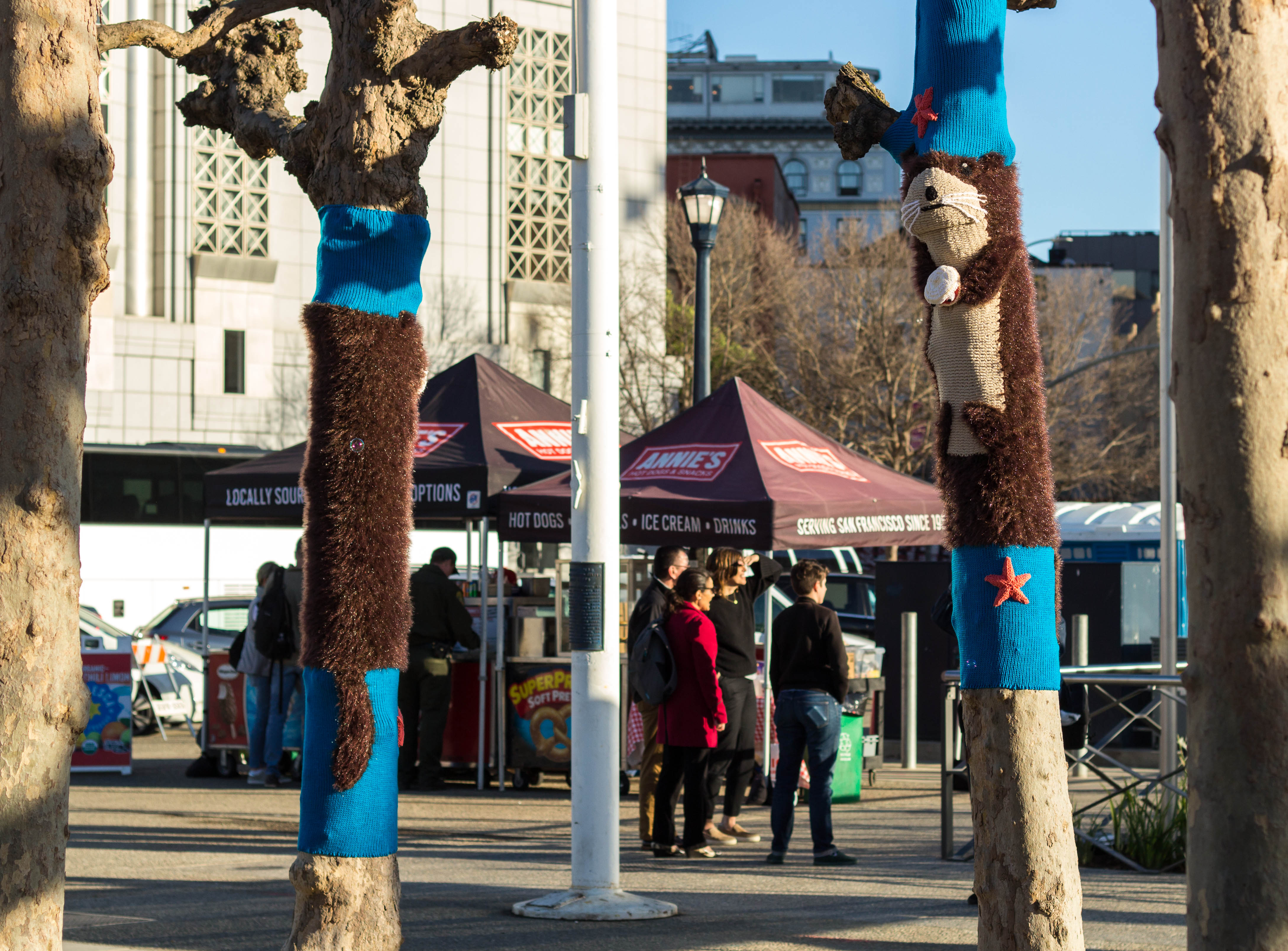 We yarn bombed two more clusters of sycamores in Civic Center Plaza, San Francisco as sea otters and chameleons for the Trust for Public Lands to celebrate the grand opening of the twin Helen Diller Playgrounds. This brings the menagerie to five different animals and 13 trees in total, not including the 60+ colorful bands we did as a trial balloon.