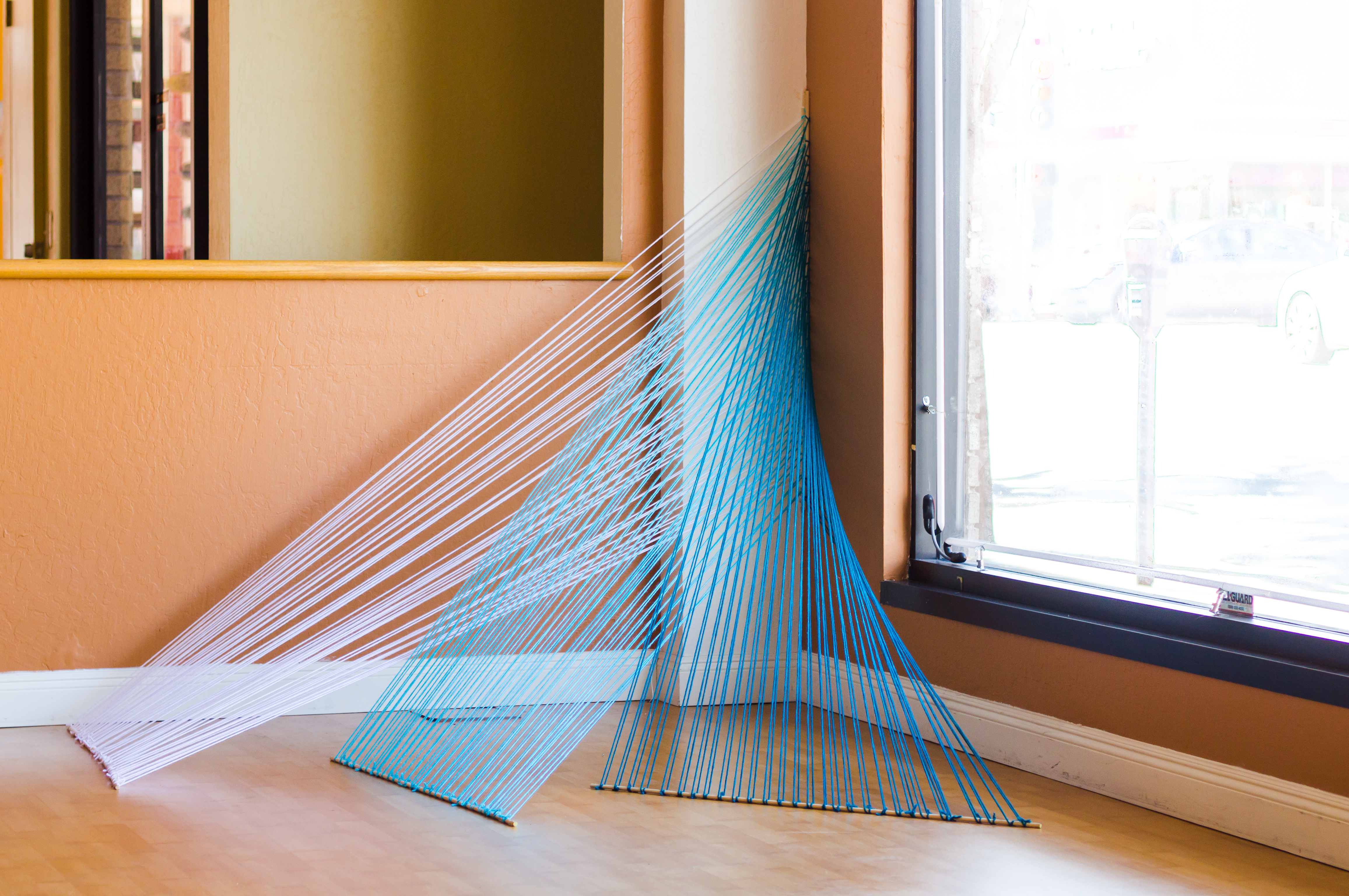 I tried an Aimee Diamond yarn installations I’ve admired for a while. I designed a reusable installation so it can pop-up again. But even better, I designed it to twist and move so I can discover what fascinating abstract geometric shapes emerge from string art. I call it Waves.