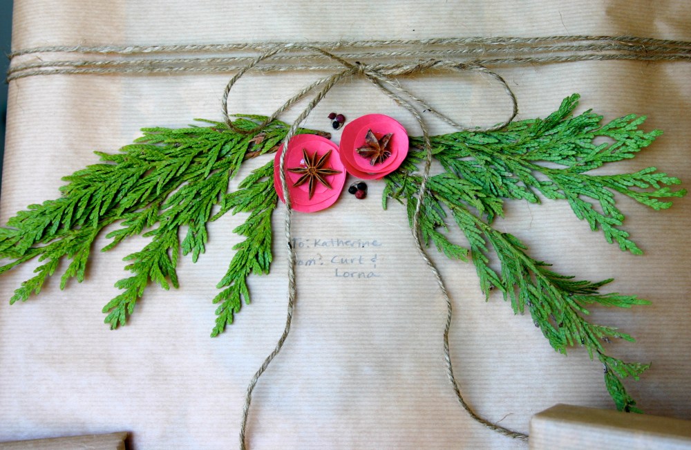 I know a lot of women haven’t outgrown the joy of creating a special package for someone on a special day. My best friend and I used to compete to wrap the most presents for each other’s birthdays. One year we wrapped not just packages of candy, but every piece of candy! Christmas is full of people to wrap for and I love sitting down to a big, clean table, a pile of odd-shaped gifts, and a stash of gift wrap. The last few years I’ve used brown paper and natural jute twine to as a canvas for other embellishments. This year my cranberry and popcorn garlands as well as our tradition of decorating oranges with cloves inspired me to use pretty spices and cutouts to create a natural woodland gift wrap. Pictured are cedar boughs, star anise, Szechuan peppercorns, construction paper and jute twine. I think they turned out so pretty! What are your favorite wrapping materials?