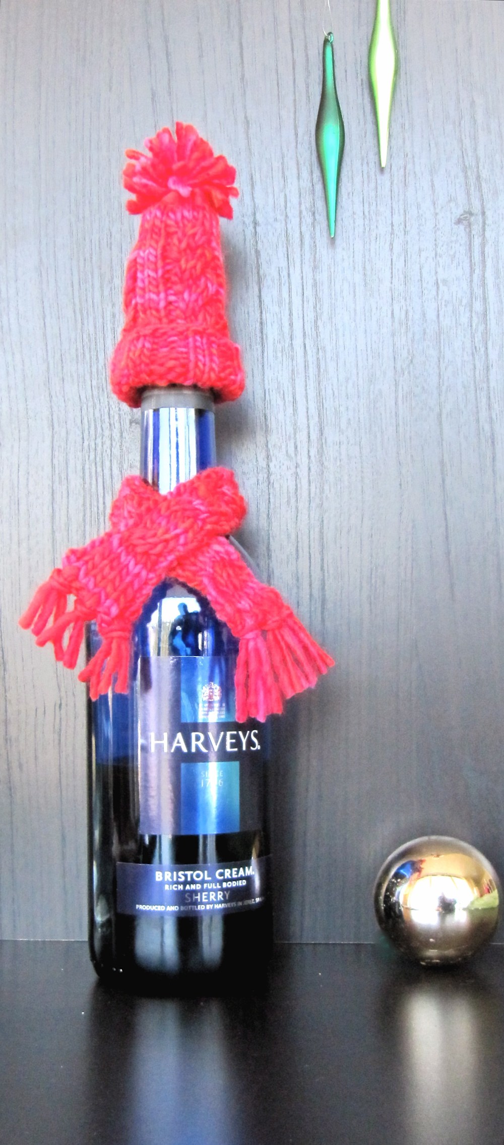 You always walk through stores remarking to yourself “Pshaw… I could make that!” But how often do go home and prove it? Here’s a free project I created to help you restore that balance and make your holiday hostess and guests squeal with delight. It’s a knit hack of one of Pottery Barn’s wine bottle accessories, a teeny hat and scarf. They sell it (probably machine made) for about $8. Now you can whip up a priceless hand made one with just half an ounce of yarn! Super duper holiday stash buster to keep your vin chaud or Sierra Nevada Christmas Ale cozy all winter.